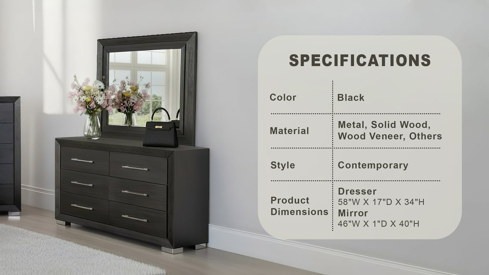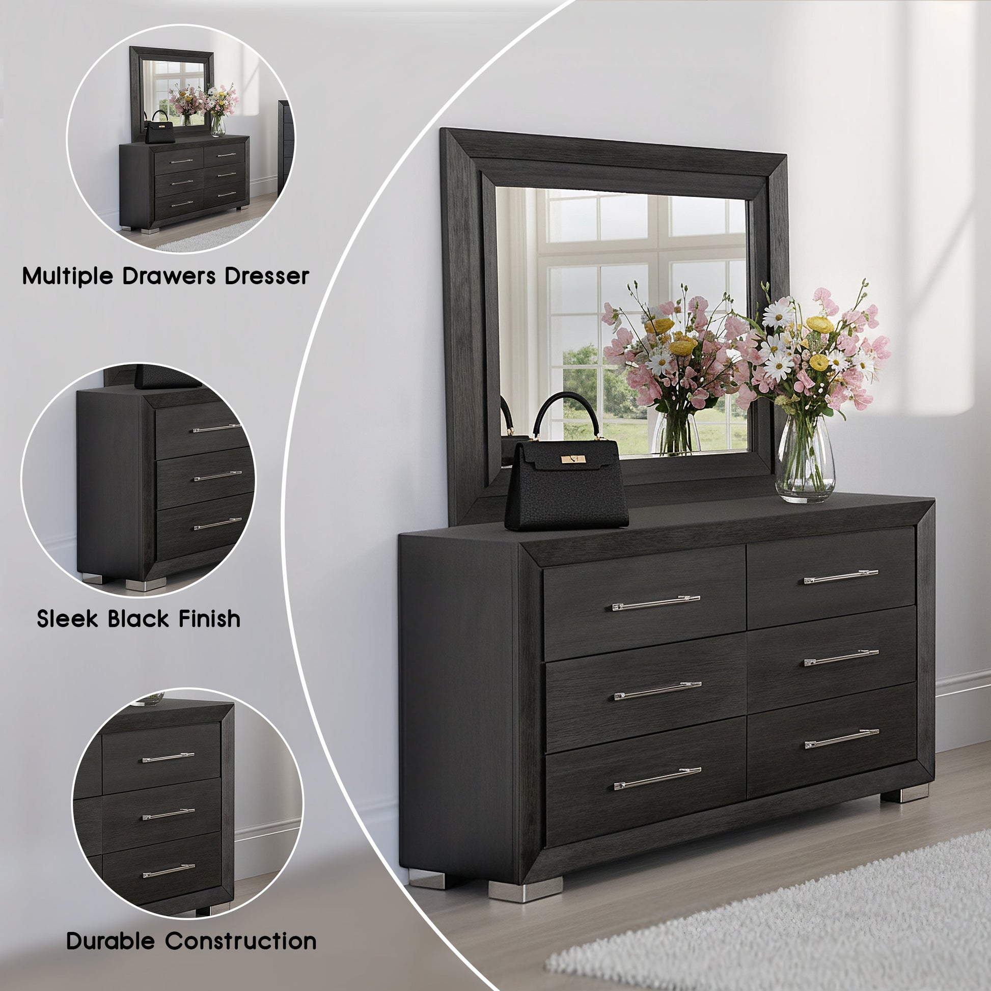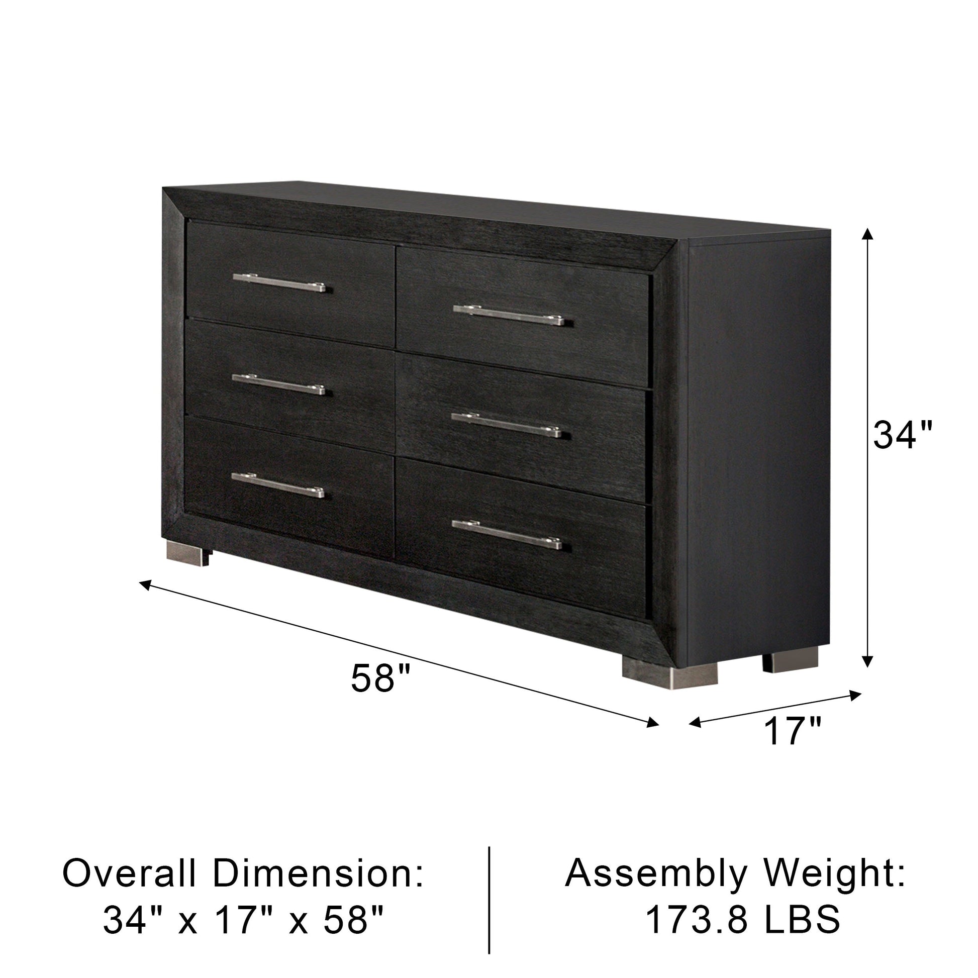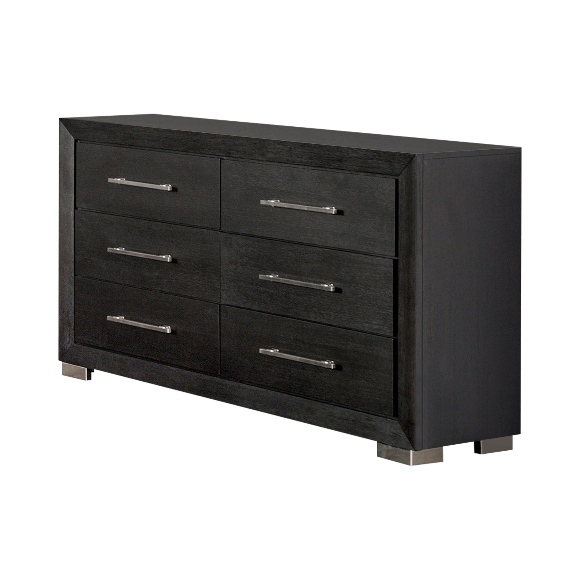 This contemporary dresser delivers a bold yet refined look to your bedroom. Its deep black finish contrasts elegantly with gleaming chrome legs, creating a stylish modern statement. Built with solid wood, wood veneer, and sturdy metal, it ensures both beauty and durability. The full-extension soft-closing drawers glide smoothly and quietly, while English dovetail construction offers lasting strength and craftsmanship.