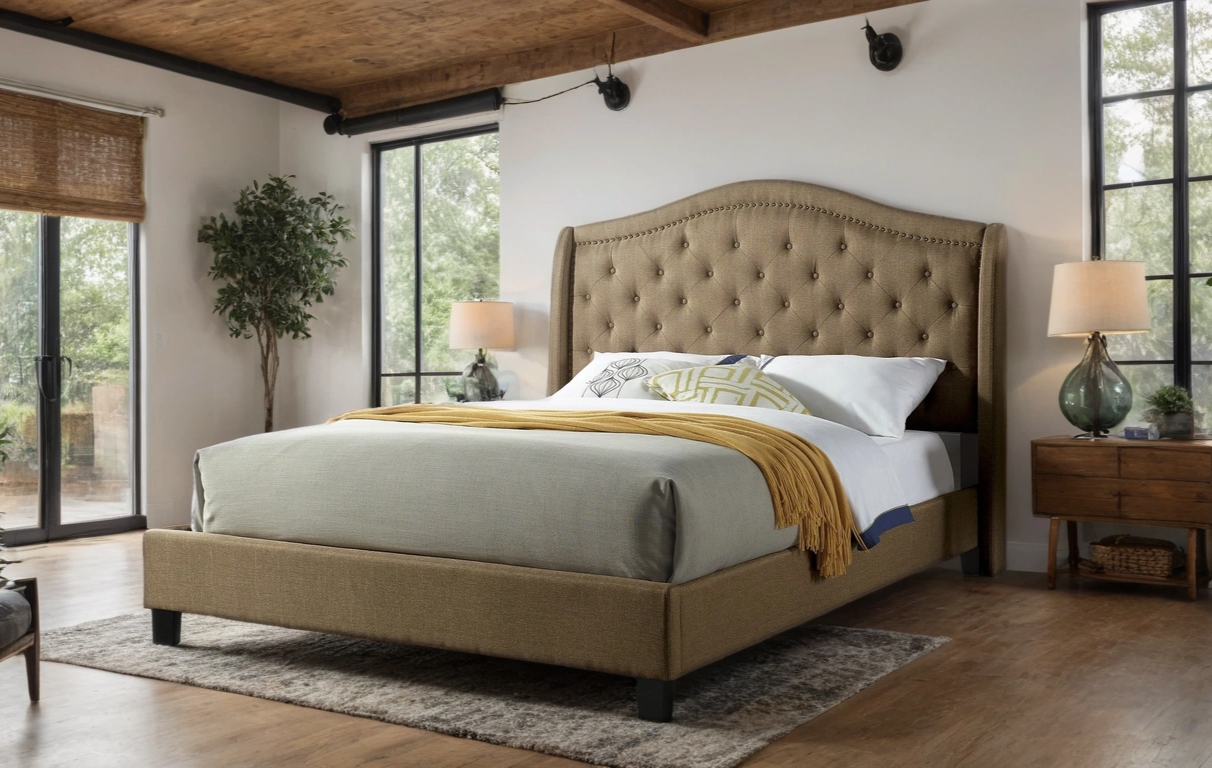 Elevate your bedroom with this stylish contemporary platform bed, designed to blend comfort and modern elegance. The warm, dark tones create a soothing ambiance, perfect for unwinding after a long day. Featuring a button-tufted headboard with padded linen and nailhead trim, this bed brings a touch of sophistication that complements any modern home. Relaxation and style come together effortlessly in this inviting design.