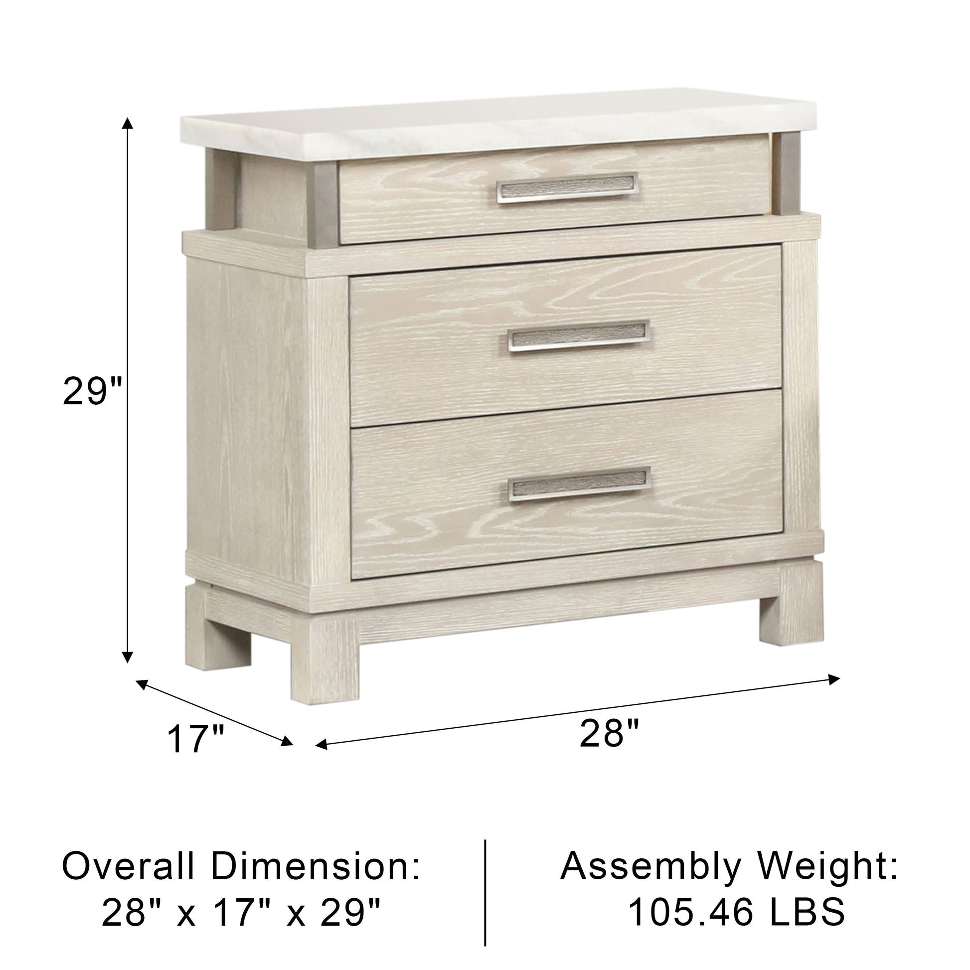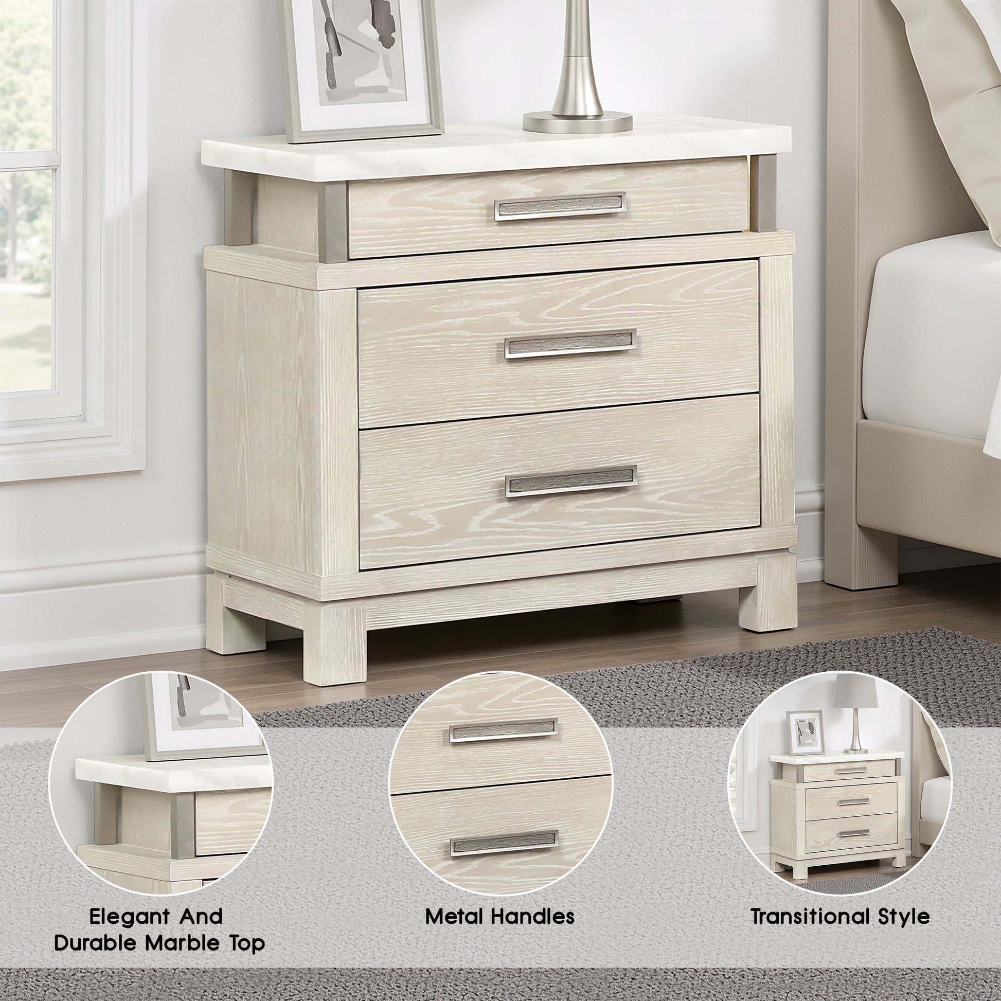 This transitional nightstand brings elevated functionality and timeless style to your bedside. The weathered gray finish adds a touch of rustic charm, while the luxurious marble top delivers an upscale contrast. Thoughtfully crafted with felt-lined top drawers, dovetail joints, and ball-bearing glides, this piece offers both beauty and durability for daily use.