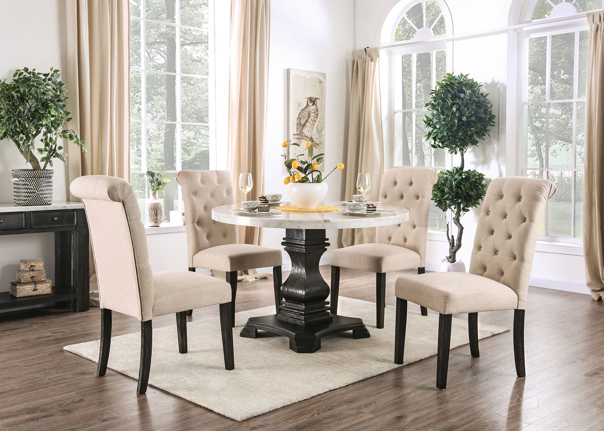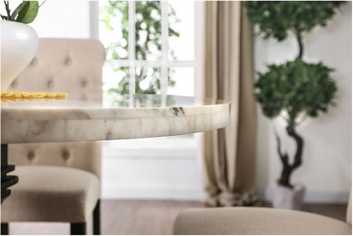 Warm and elegant, this round dining table exudes the charm of a treasured family heirloom. Its genuine marble top adds a touch of sophistication, beautifully supported by a classic pedestal base in an antique black finish. Perfectly sized for a casual breakfast nook or an intimate formal dining room, this table combines timeless design with everyday practicality to create a welcoming centerpiece for your home. Choose your side chair colors from Gray, Ivory or Light Grey.