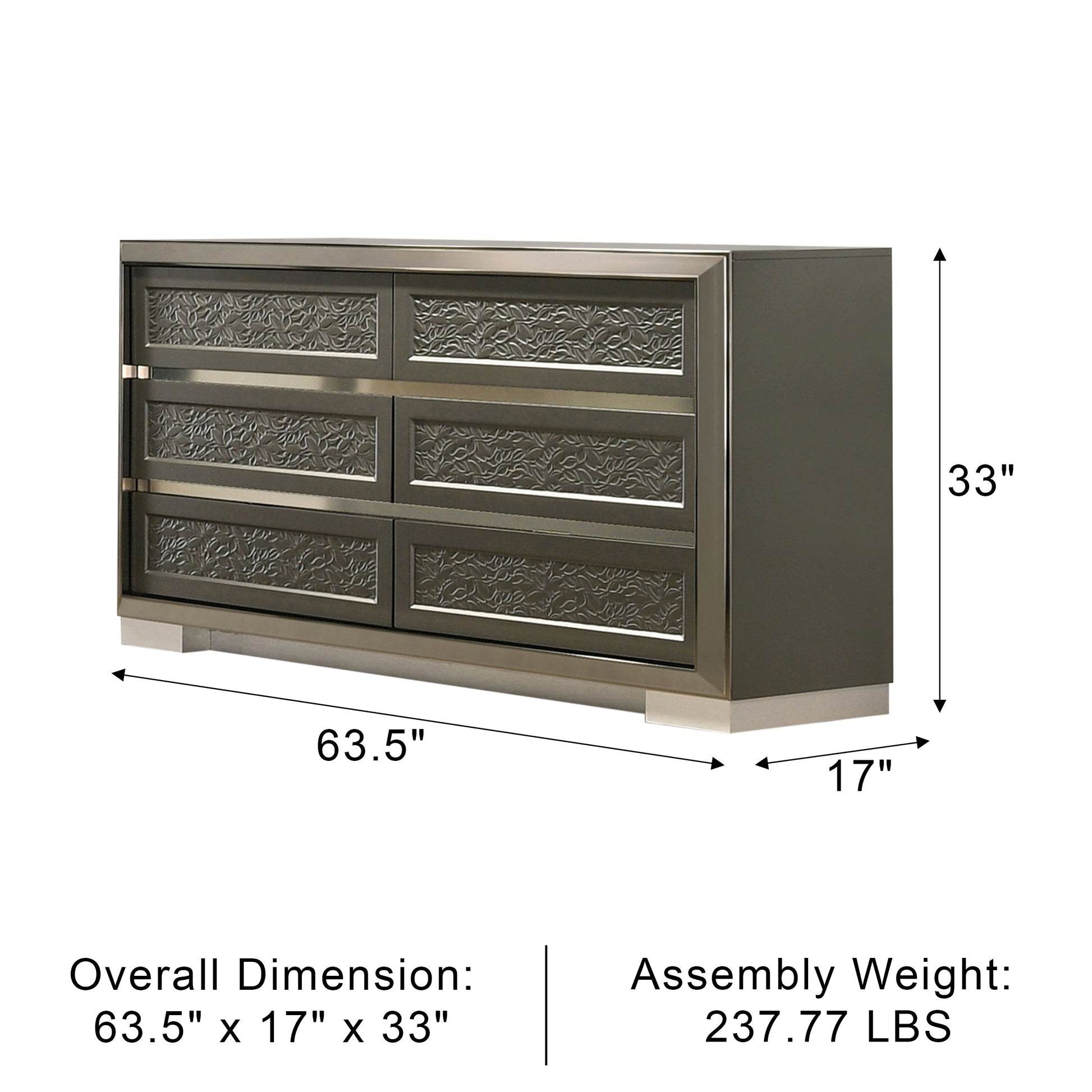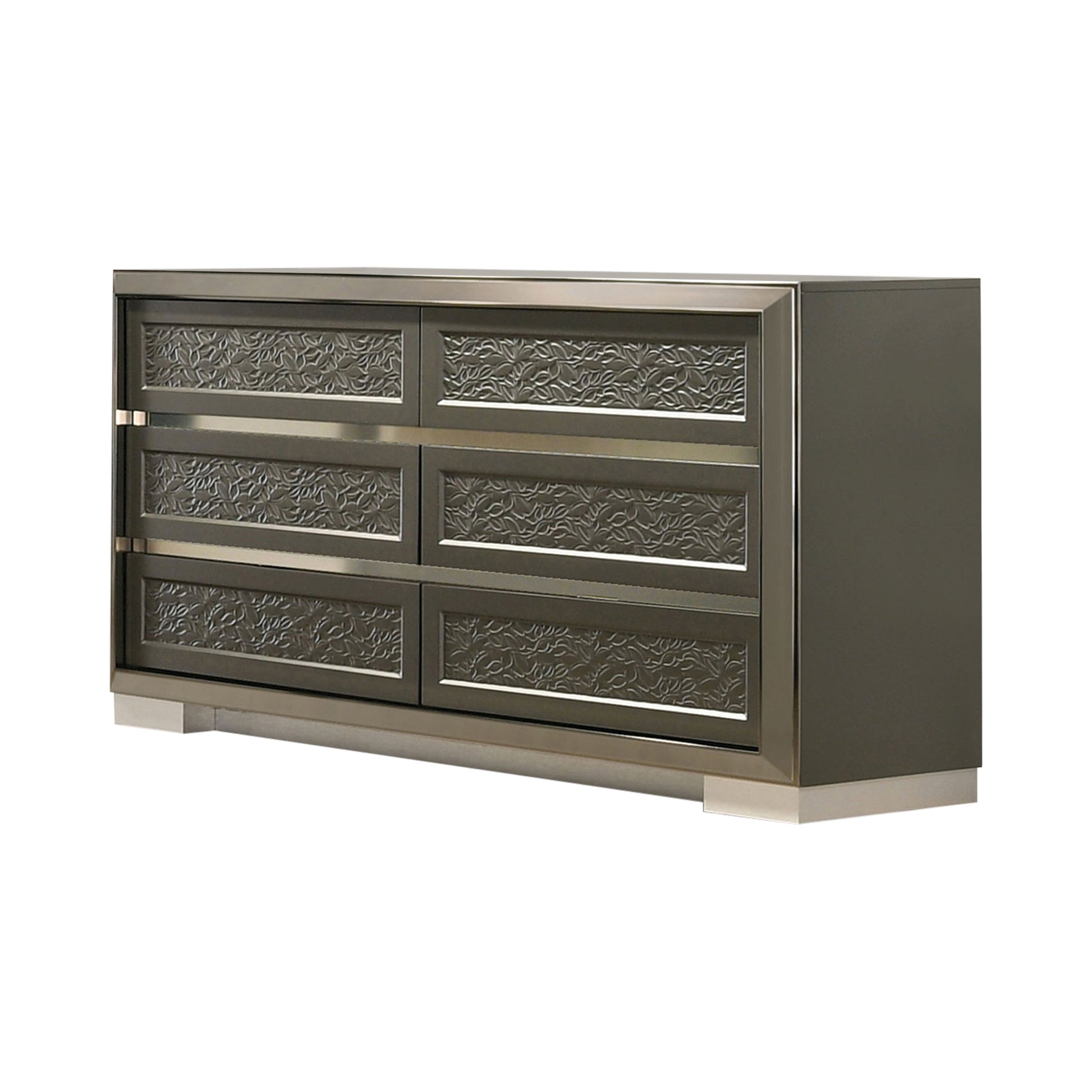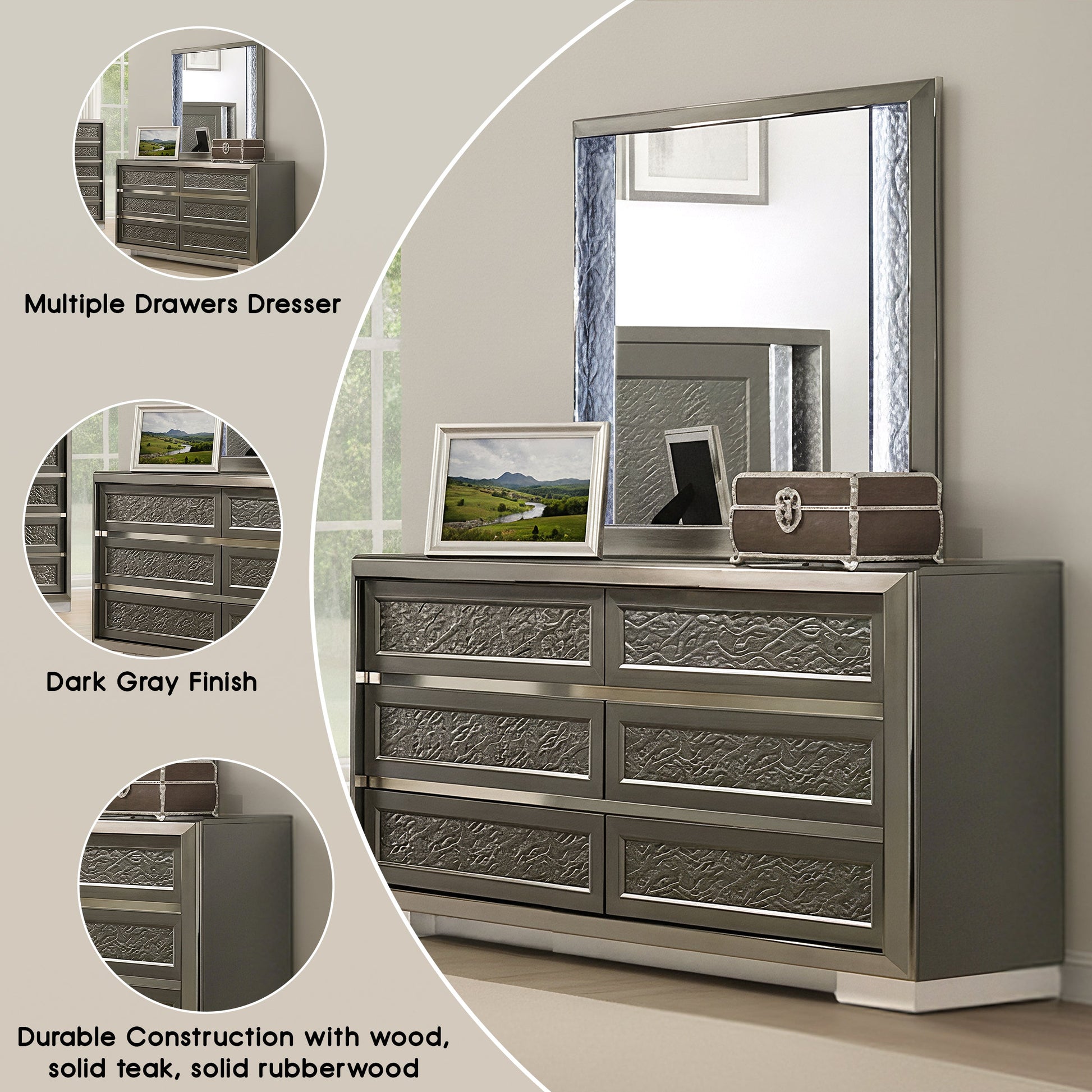 This contemporary dresser combines modern elegance with functional storage. Crafted from engineered wood, solid teak, and rubberwood, it showcases a deep dark gray finish that complements a variety of bedroom styles. The distinctive leaf pattern moulding adds subtle artistic flair, while sturdy bracketed feet offer both stability and style. Felt-lined top drawers keep valuables protected, and smooth metal side glides ensure effortless drawer operation. Perfect for keeping your essentials organized while enhancing your bedroom’s aesthetic.