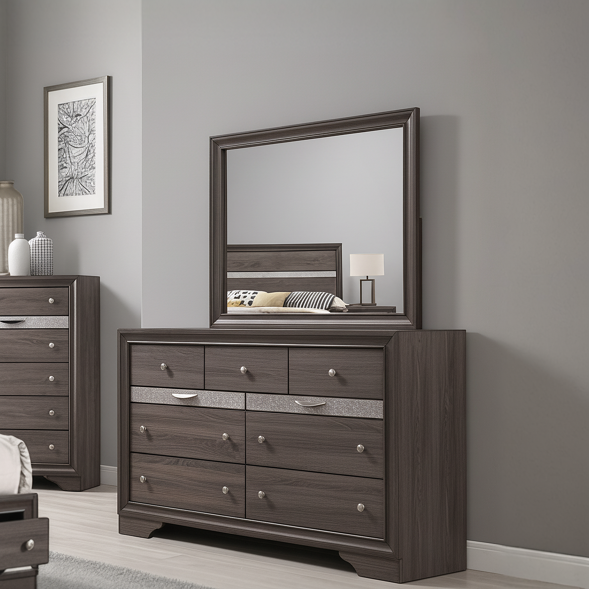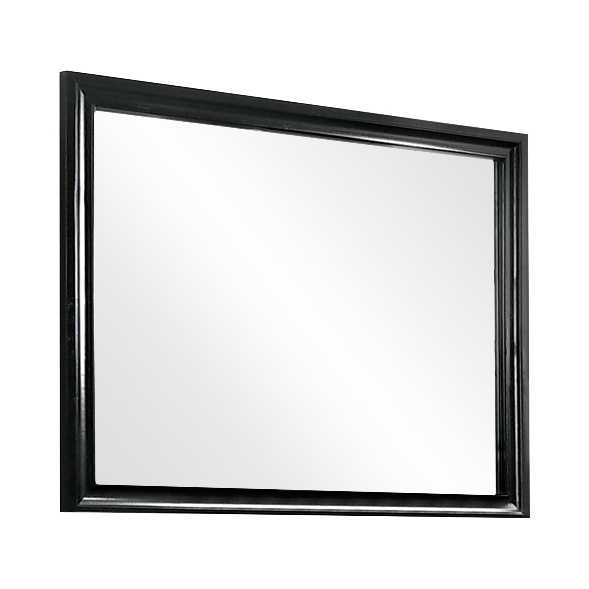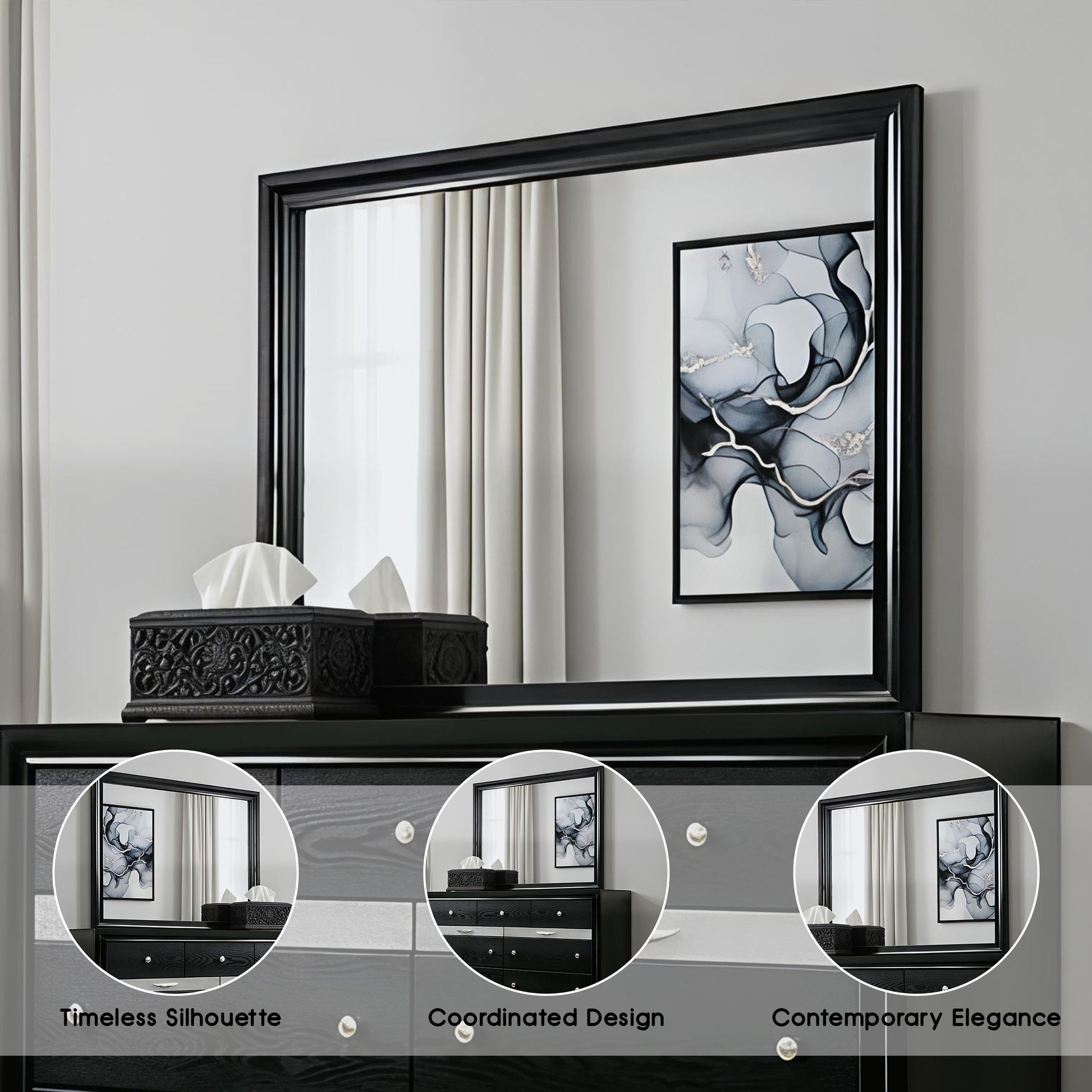 Complete your glamorous bedroom ensemble with this striking mirror. The contemporary black or gray frame is accented with a lustrous sheen that coordinates beautifully with the matching dresser. Sleek and minimal in form, this mirror enhances any space with a sense of brightness and modern sophistication. It’s the perfect finishing touch for your dream room.