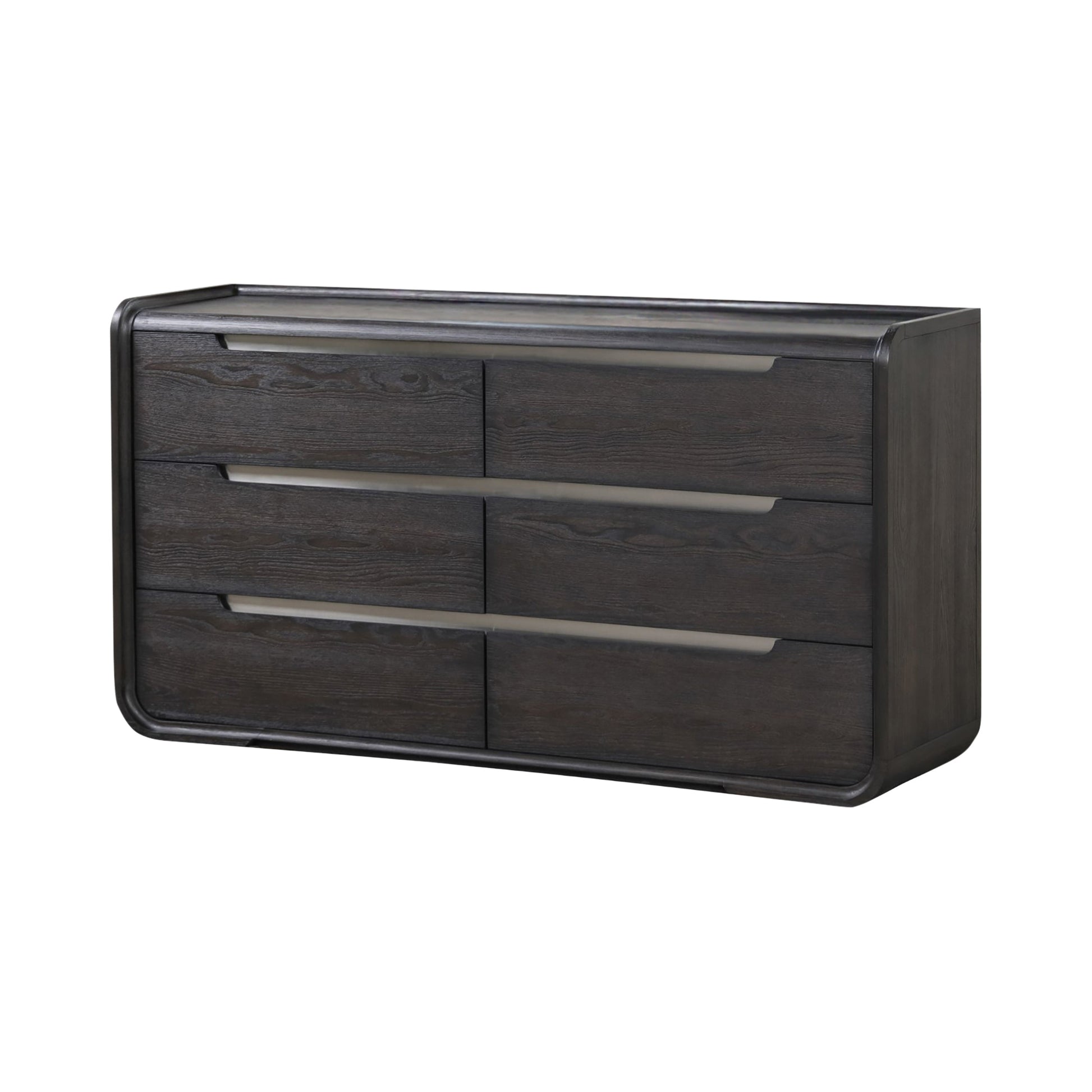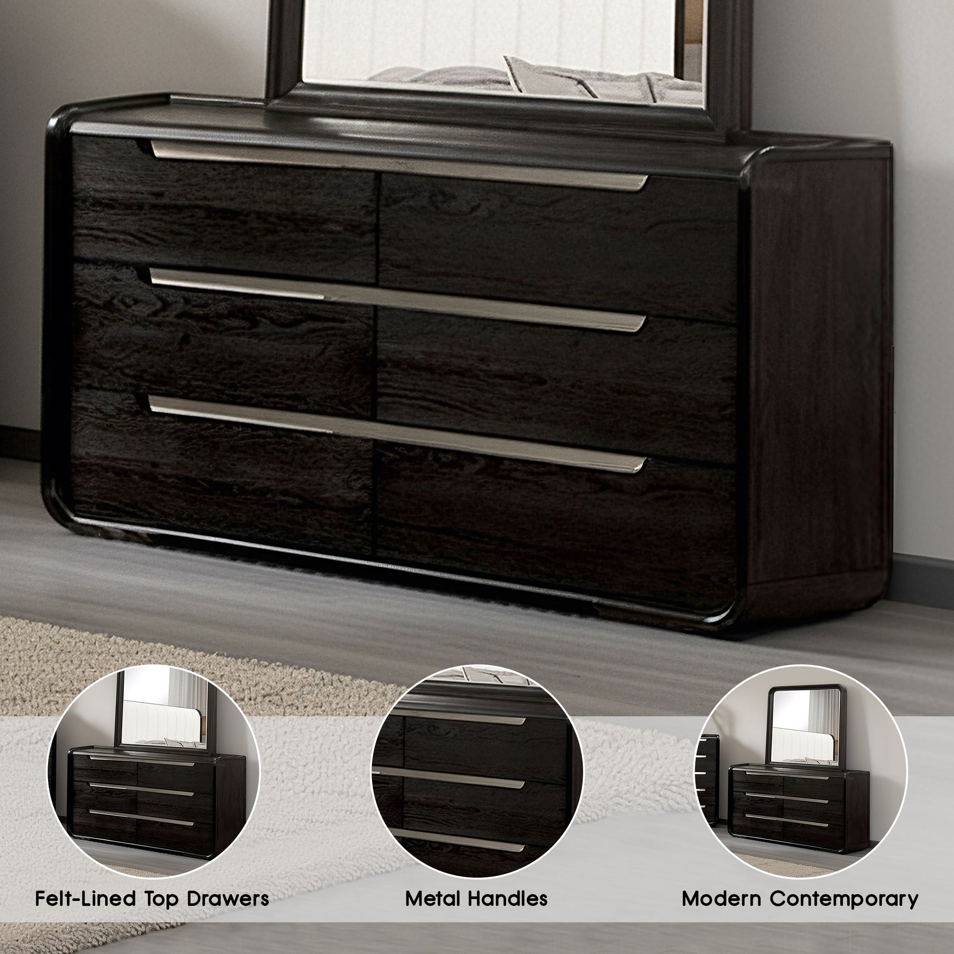 This modern contemporary dresser elevates your bedroom with refined elegance and functional design. The rich black finish is paired with sleek nickel-finished stainless steel trim, creating a bold yet polished aesthetic. Crafted with solid poplar and elm veneer, it features felt-lined top drawers for safekeeping delicate items and UV-stained lower drawers for lasting color. With smooth ball-bearing glides and robust dovetail drawer construction, this dresser blends style and substance beautifully.