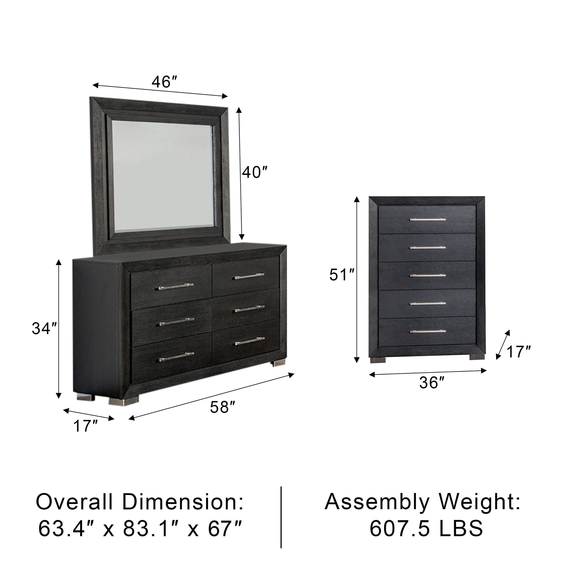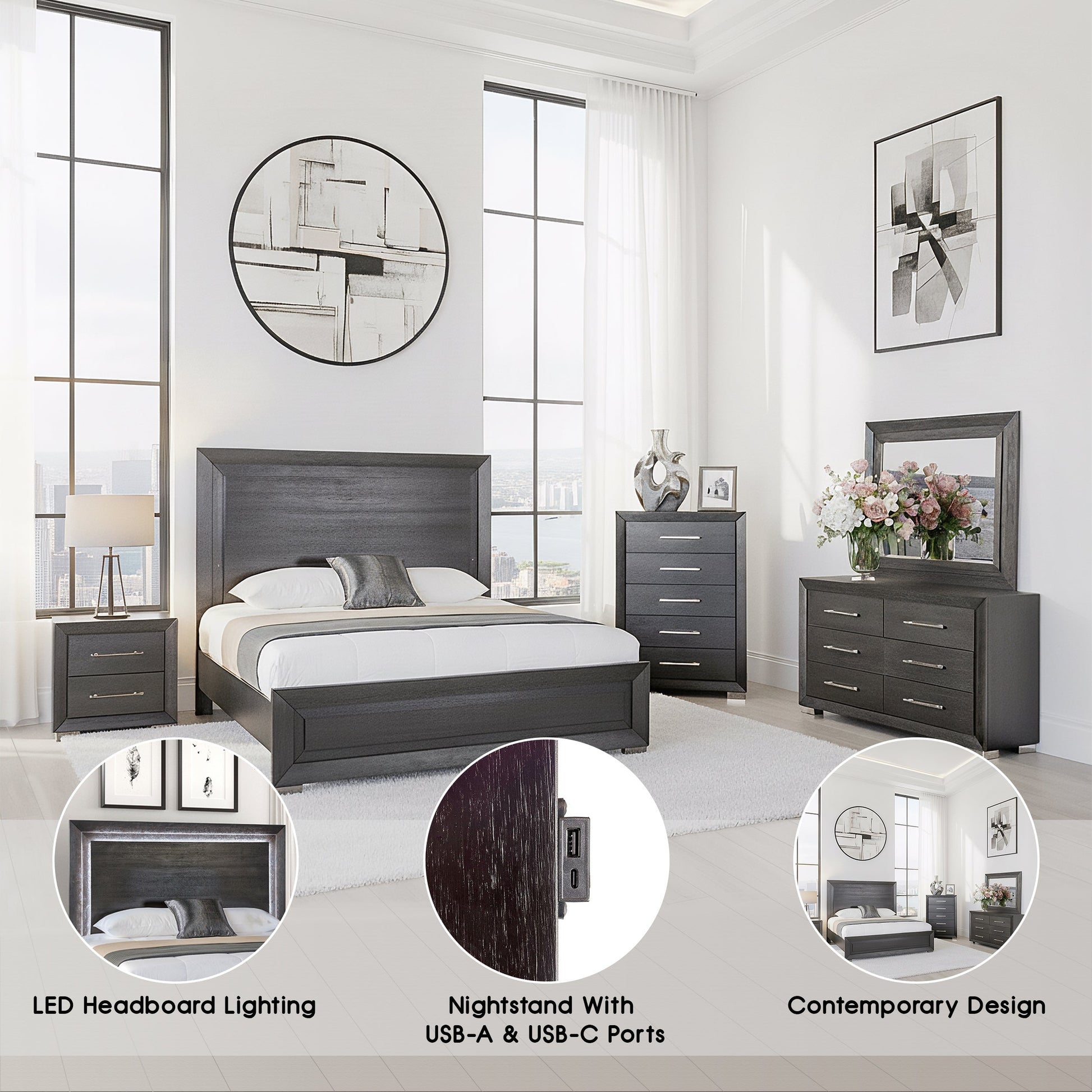 5-piece queen bedroom set offers a sleek blend of style, comfort, and functionality. Featuring a bold black finish with chrome legs, each piece adds a sophisticated touch to your space. The queen bed includes an LED-lit headboard for ambient lighting, while the nightstand’s USB-A and USB-C ports keep devices charged and within reach. Full-extension soft-closing drawers with English dovetail construction ensure smooth, durable storage, making this set both beautiful and practical.