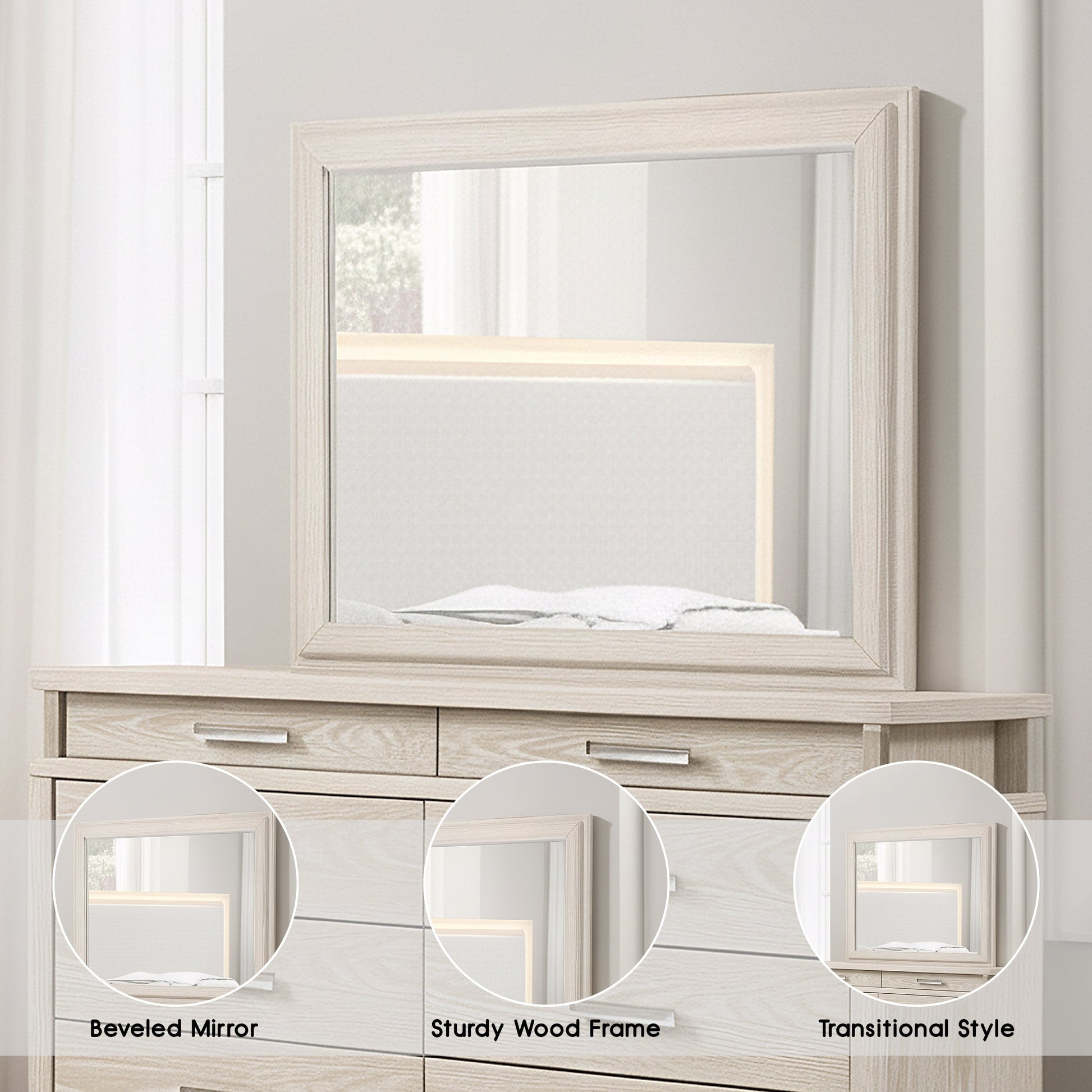 Complete your bedroom with the refined charm of this transitional mirror. Framed in a weathered gray finish, it highlights the natural beauty of the wood while adding a touch of rustic sophistication. The beveled edge adds depth and elegance, making it a perfect complement to any coordinating dresser or bedroom set.