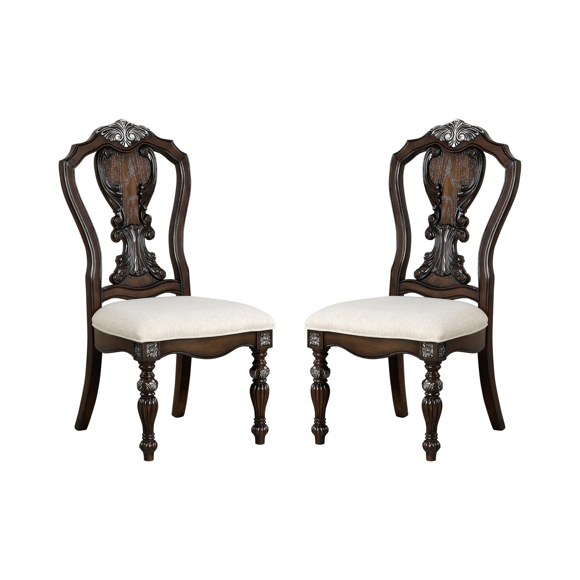 Classic elegance meets timeless craftsmanship in this traditional side chair set. Crafted from solid rubberwood and oak veneer, each chair features a rich dark brown finish that enhances the graceful silhouette. Intricate details and a refined form make these chairs a perfect complement to any formal dining setting. Designed for comfort and style, they reflect the sophistication of a well-appointed dining room.