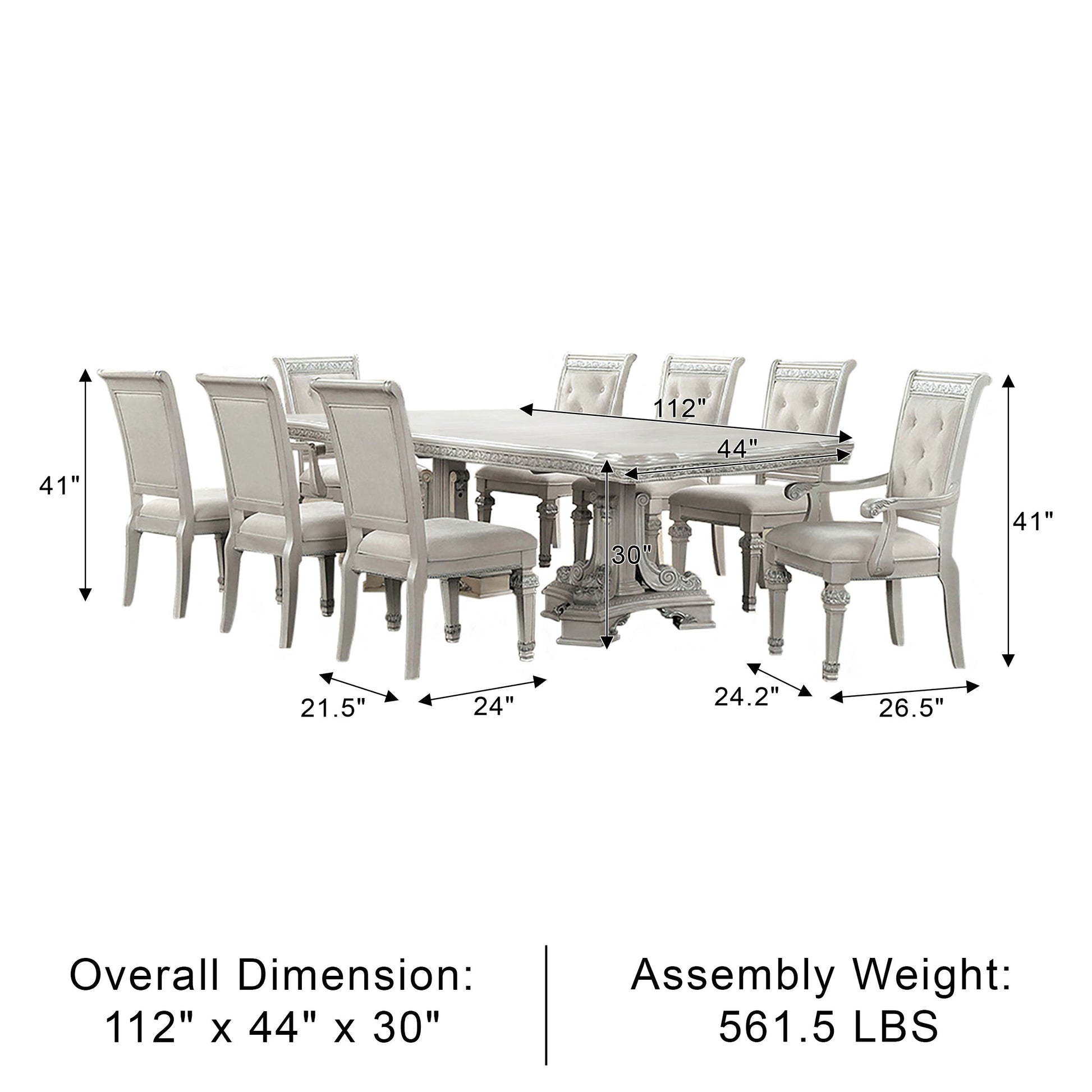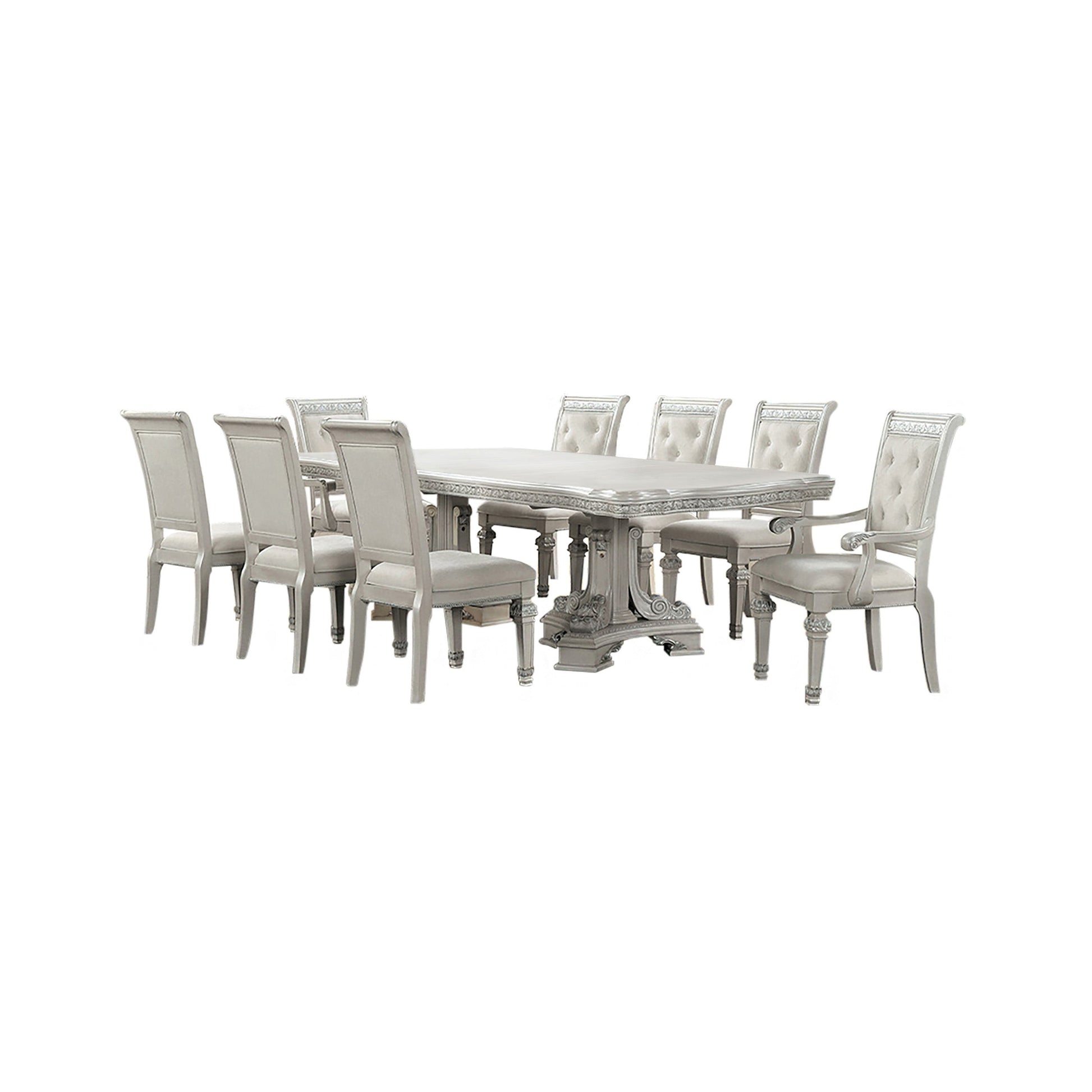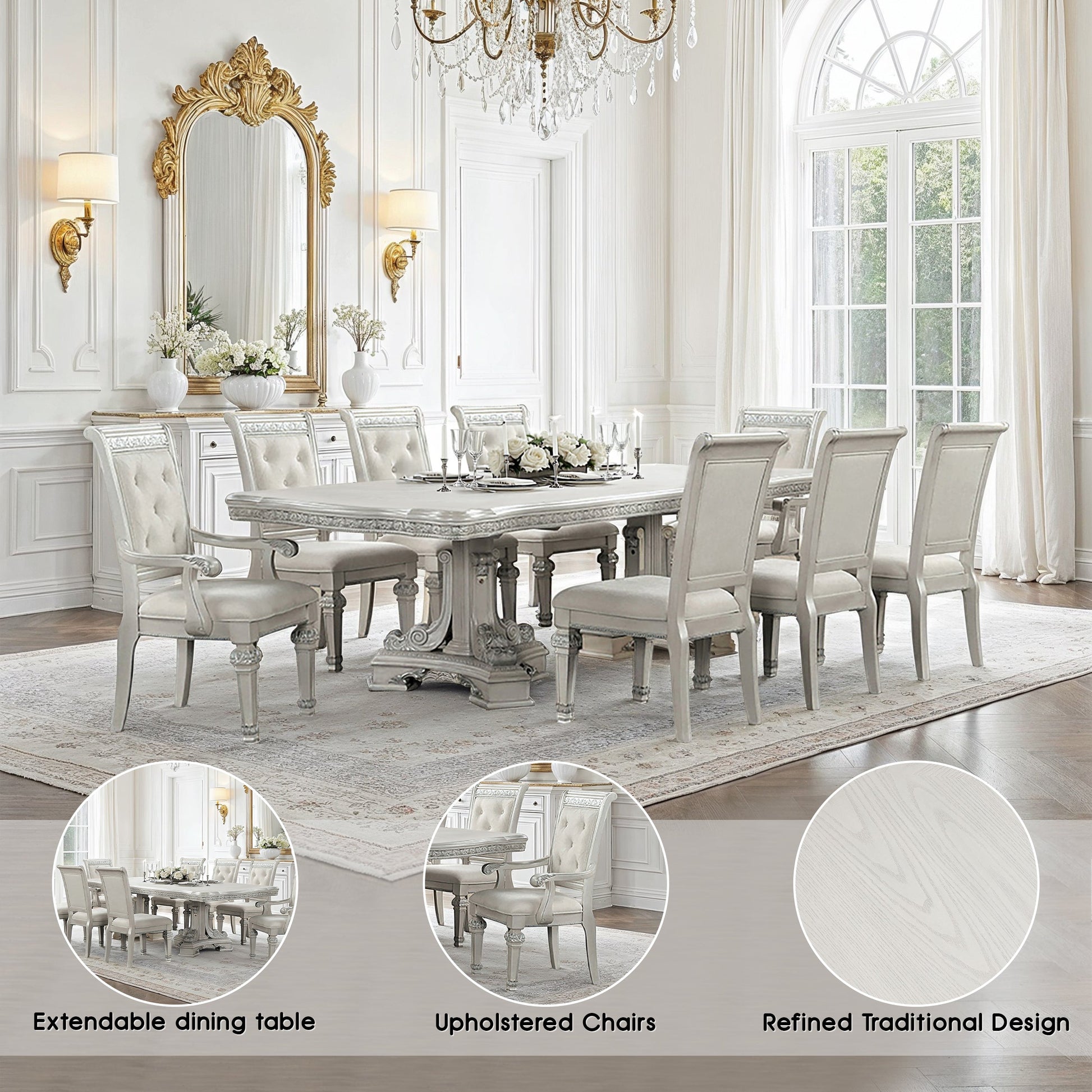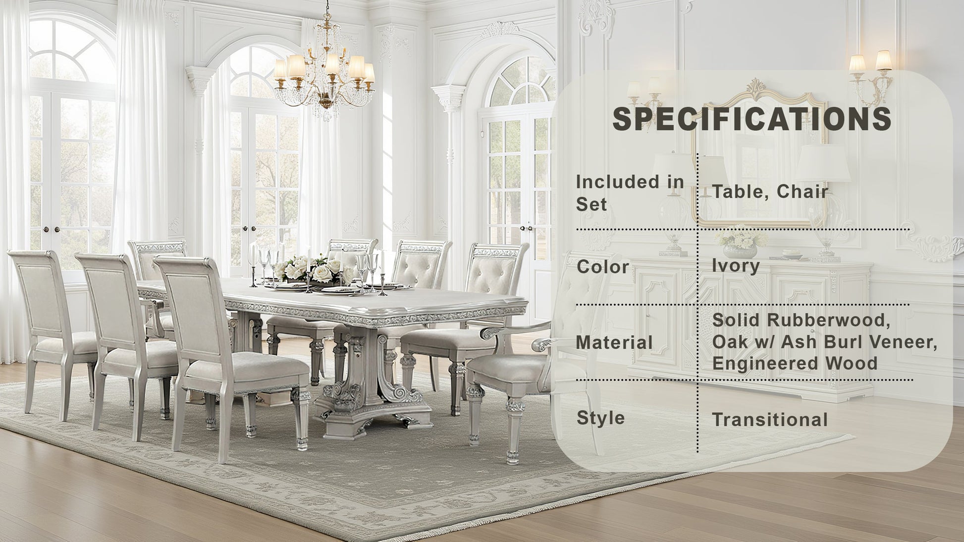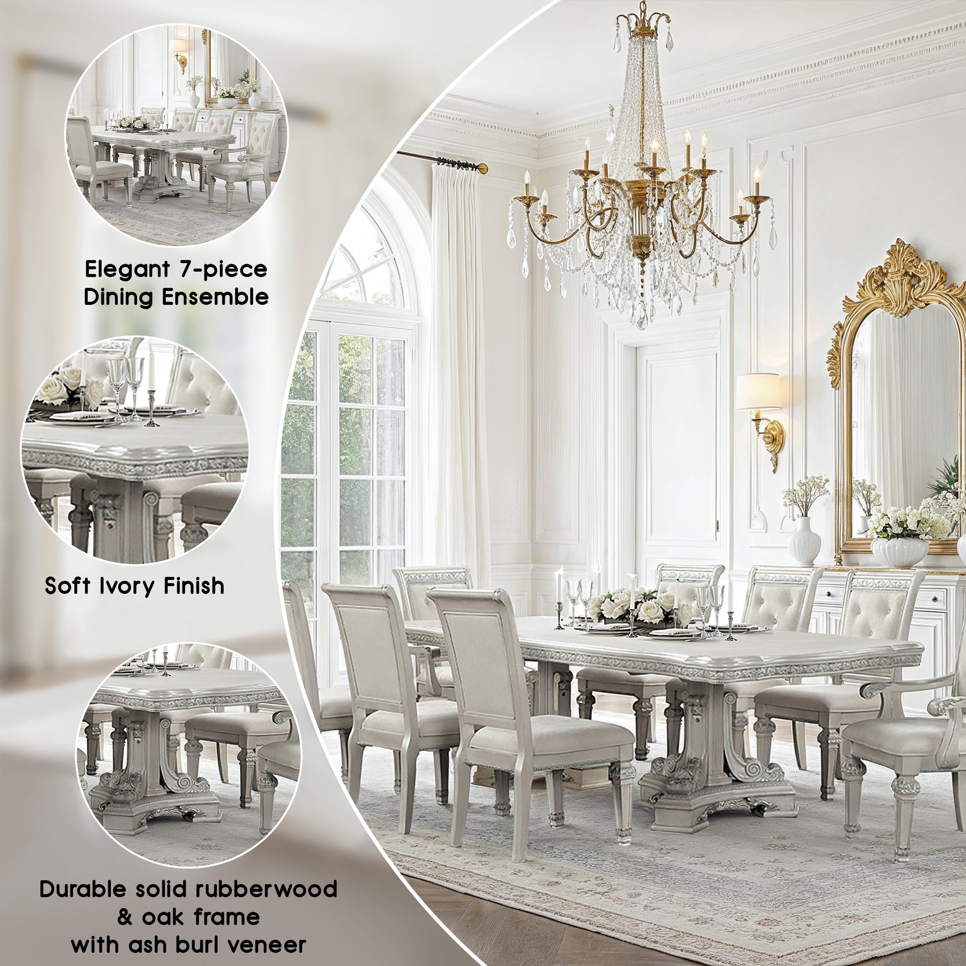 Bring timeless sophistication to your dining space with this exquisite traditional dining set. Finished in a graceful ivory tone, the table and chairs feature classic silhouettes highlighted by ornate corbels and rich ash burl veneer accents. The table offers versatile functionality with two 18-inch extendable leaves, perfect for hosting gatherings. Crafted with premium materials, the set includes felt-lined drawers and smooth ball-bearing glides for refined convenience, while mirrored back panels on the hutch, buffet, and curio add light and depth to your display.