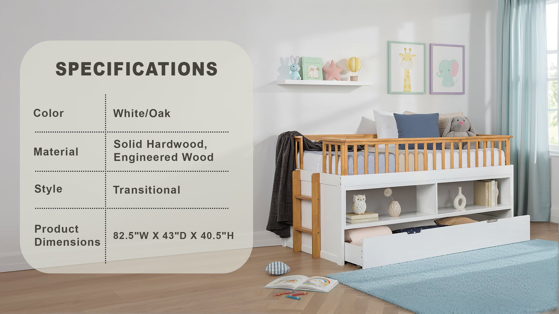Designed with both style and function in mind, this transitional twin captain bed offers the perfect space-saving solution for modern bedrooms. The built-in bookcase headboard and open shelves keep essentials close at hand, while the included trundle adds sleeping flexibility. Finished in a bright white with light oak accents, the bed delivers a refreshing look and dependable durability thanks to solid hardwood construction and mortise & tenon joinery.