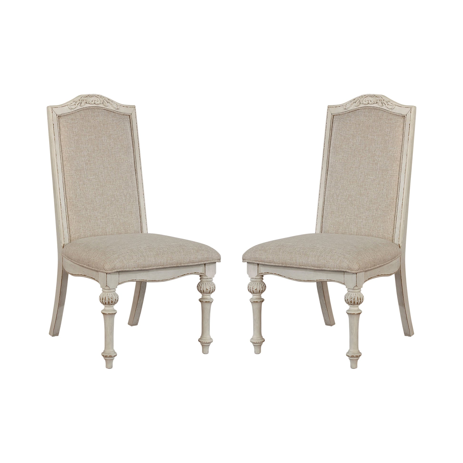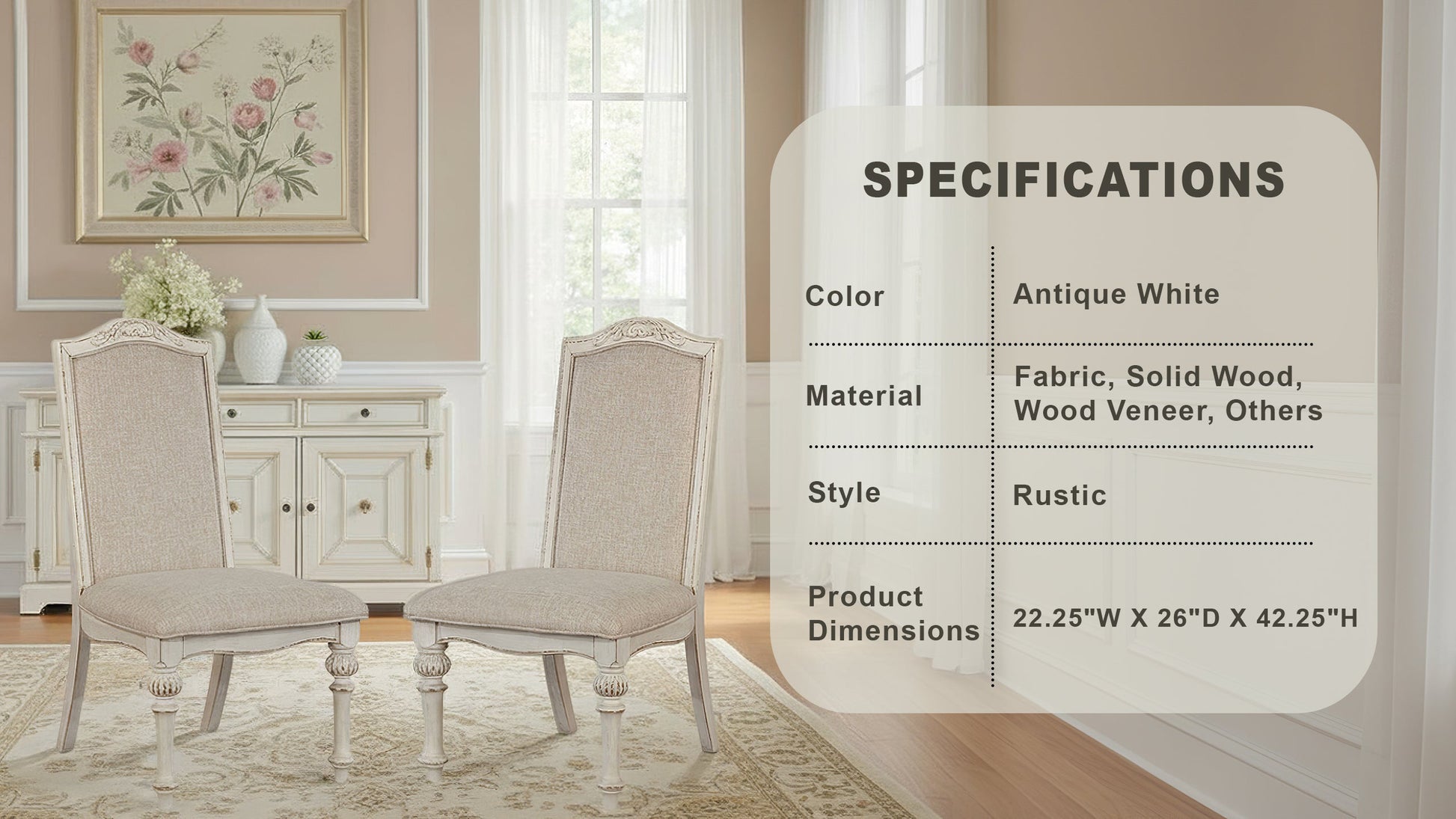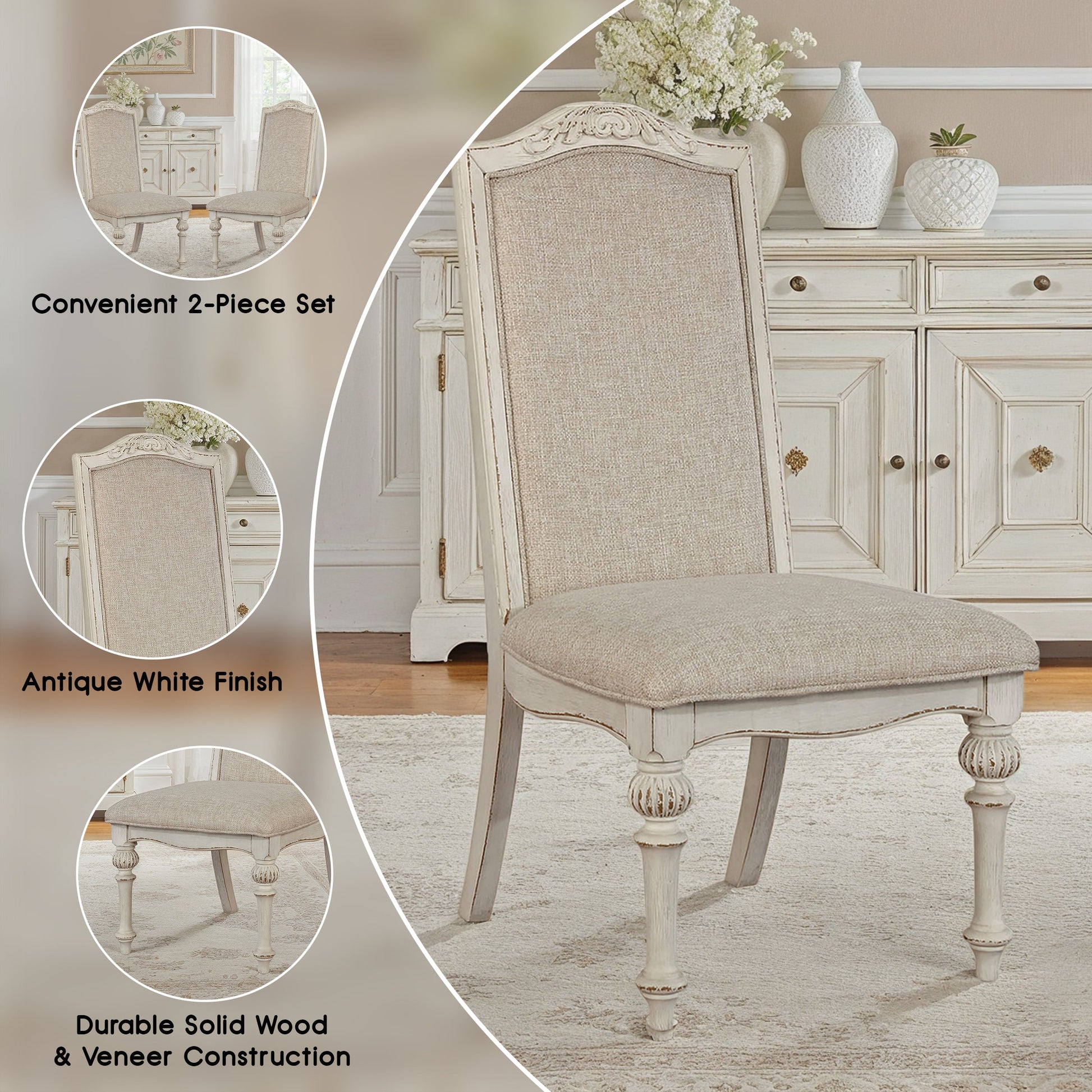 Elevate your dining space with the timeless charm of this rustic-inspired chair set, where intricate wood inlay details make a grand visual statement. The antique white finish brings a sense of warmth and heritage, while the soft upholstered seats add inviting comfort and contrast. Crafted from solid wood, wood veneer, and premium fabric, each chair blends classic craftsmanship with cozy sophistication. Sold as a set of two, these chairs are a perfect pairing of elegance and everyday comfort.