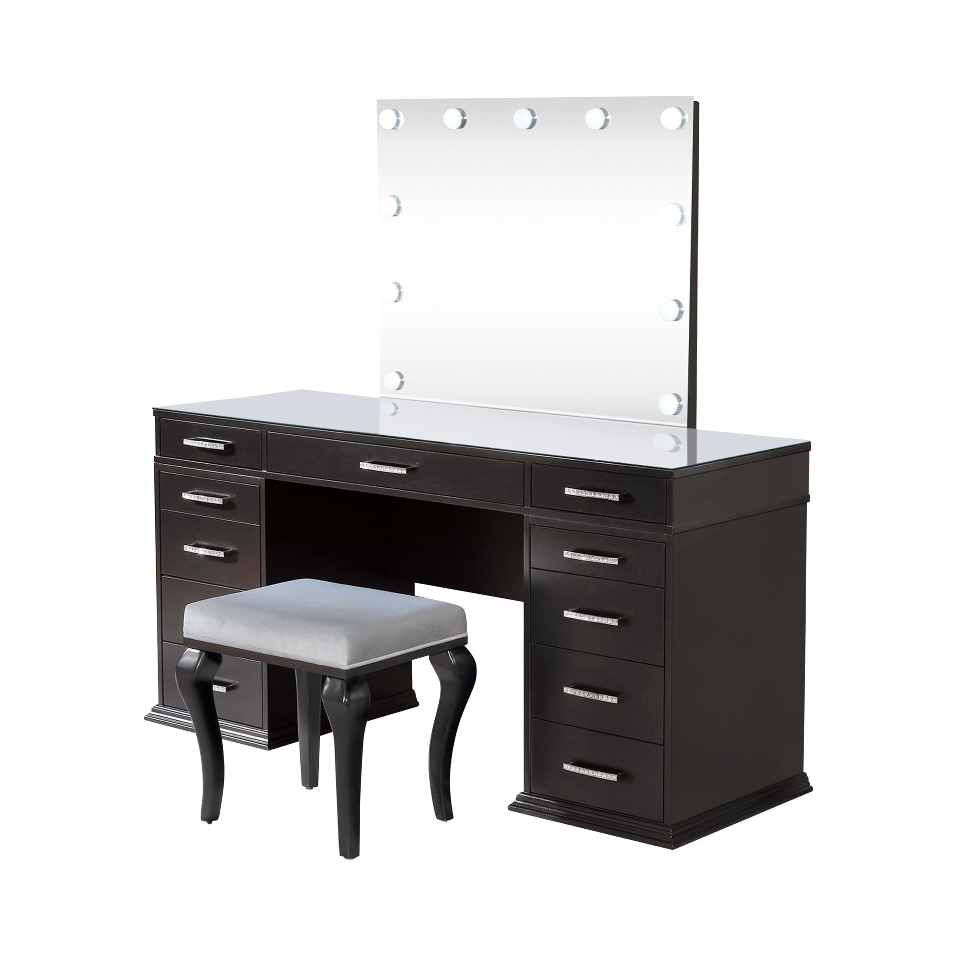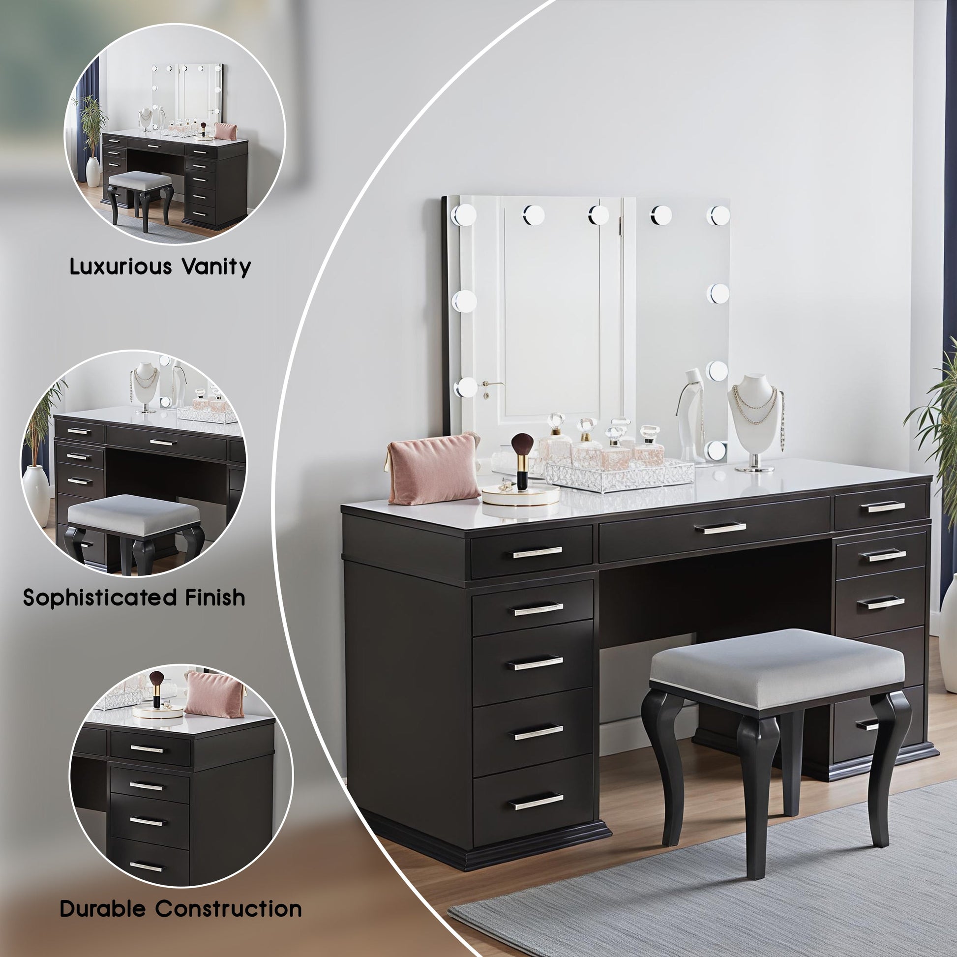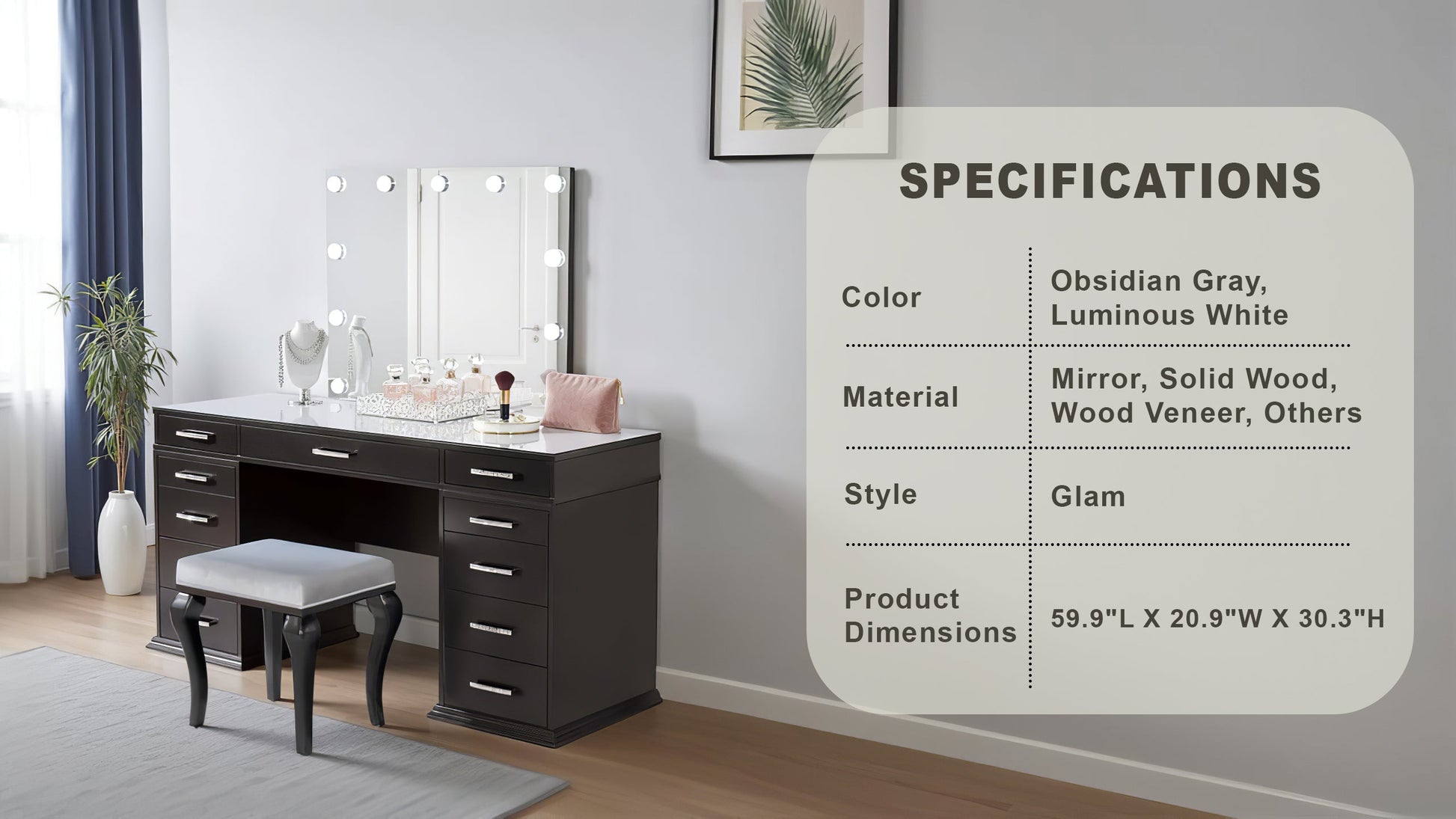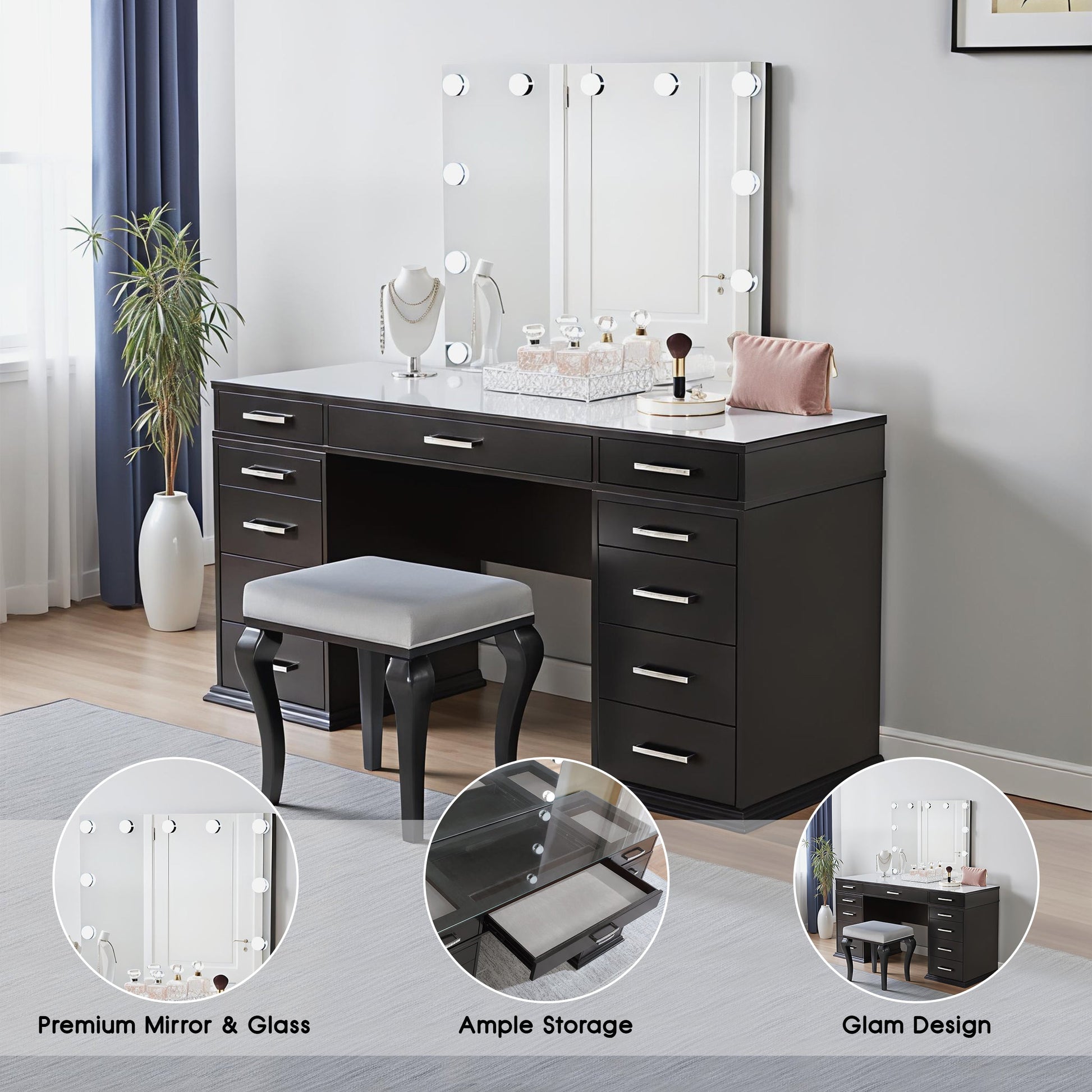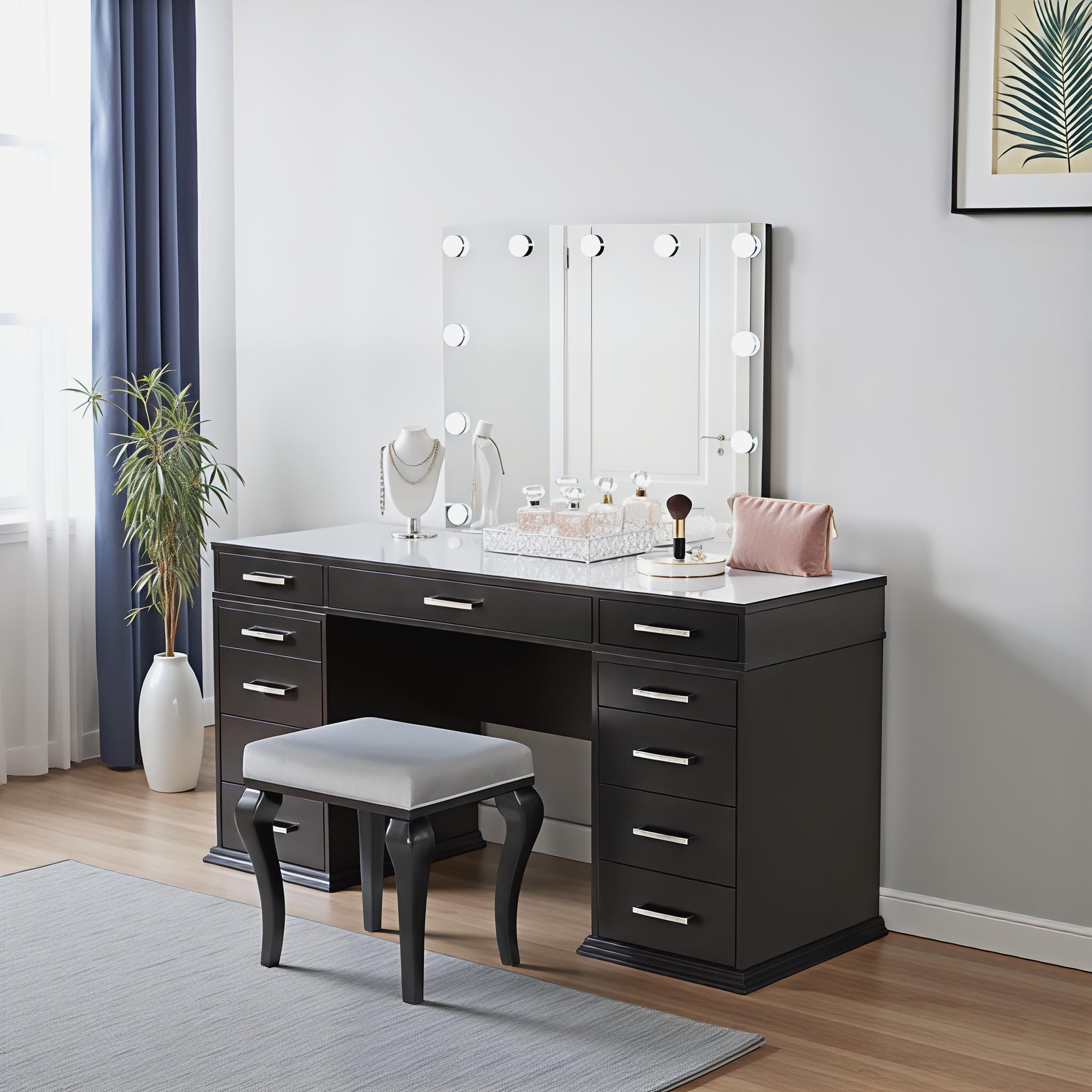 This glam vanity set features a sophisticated finish, perfect for adding luxury to any space. Crafted from solid wood, wood veneer, mirror, and other quality materials, it ensures durability with a stunning aesthetic. The 4mm central mirror is complemented by 8mm clear tempered glass for clarity and strength. Multiple storage drawers provide ample space to organize your essentials. A padded stool completes the set, offering comfort and style for your beauty routine.