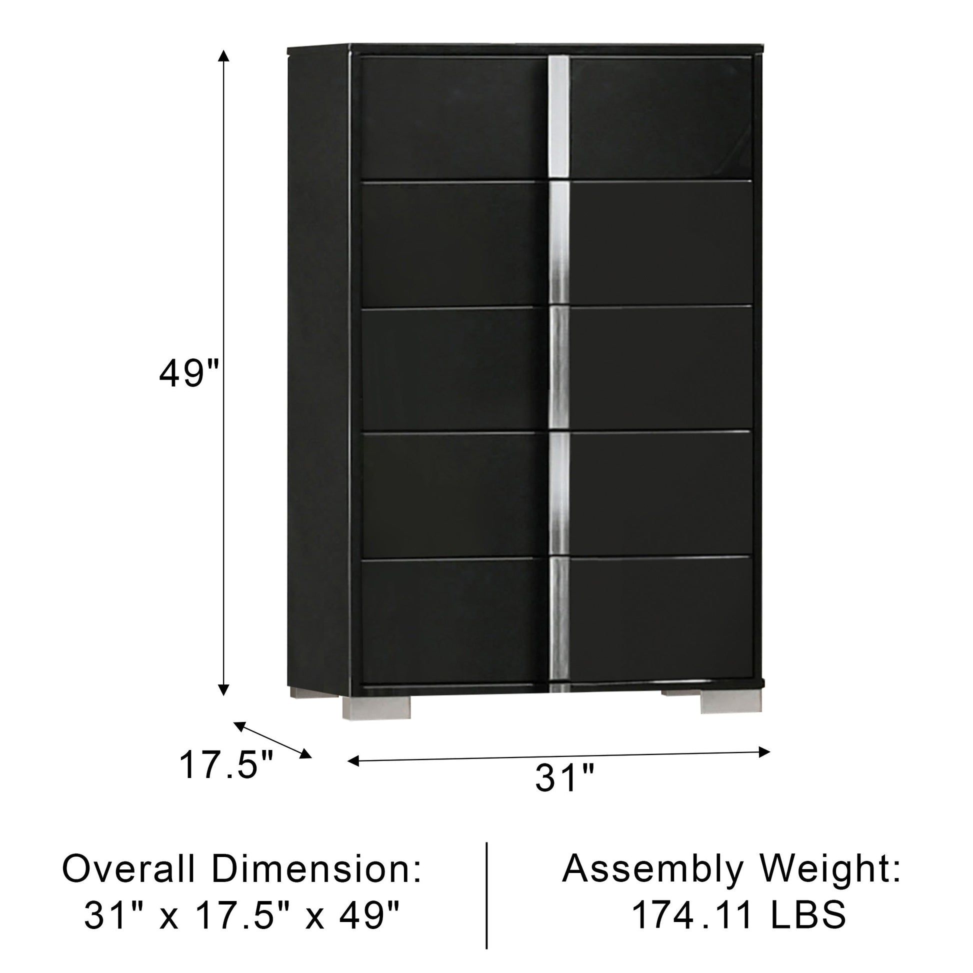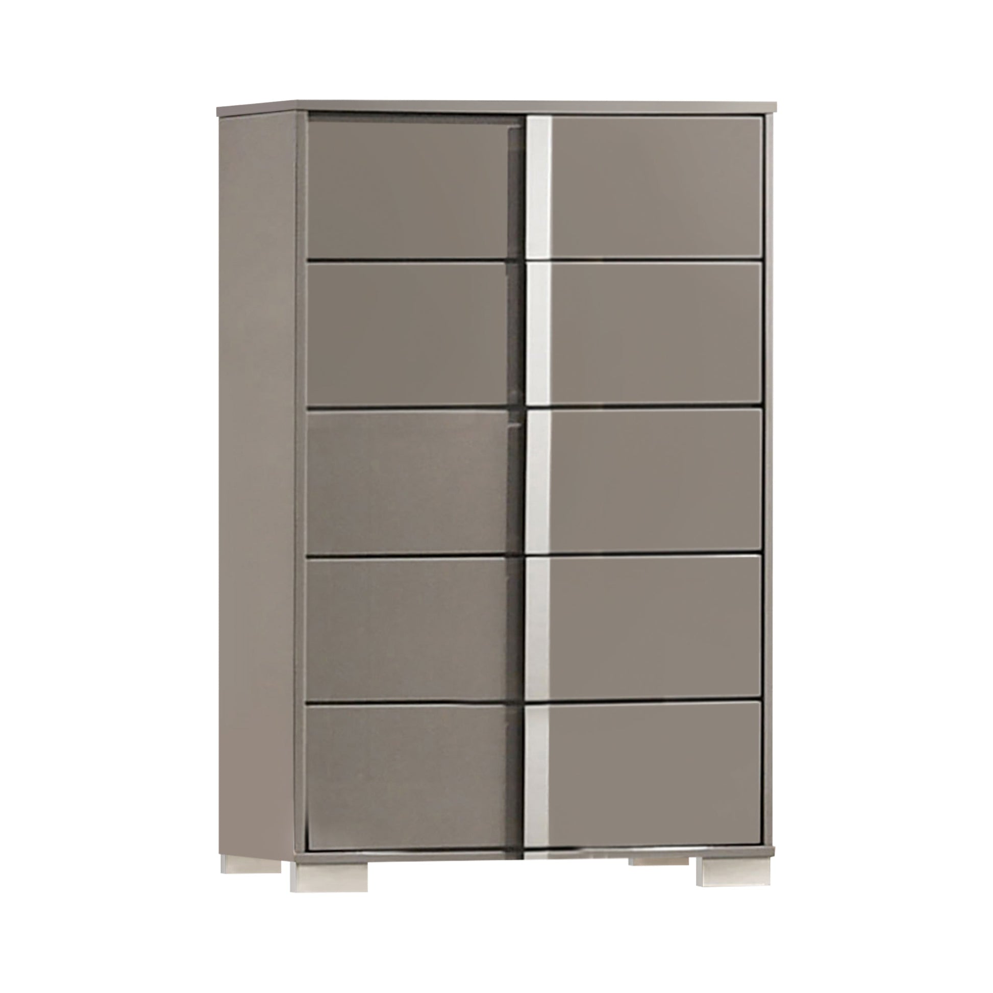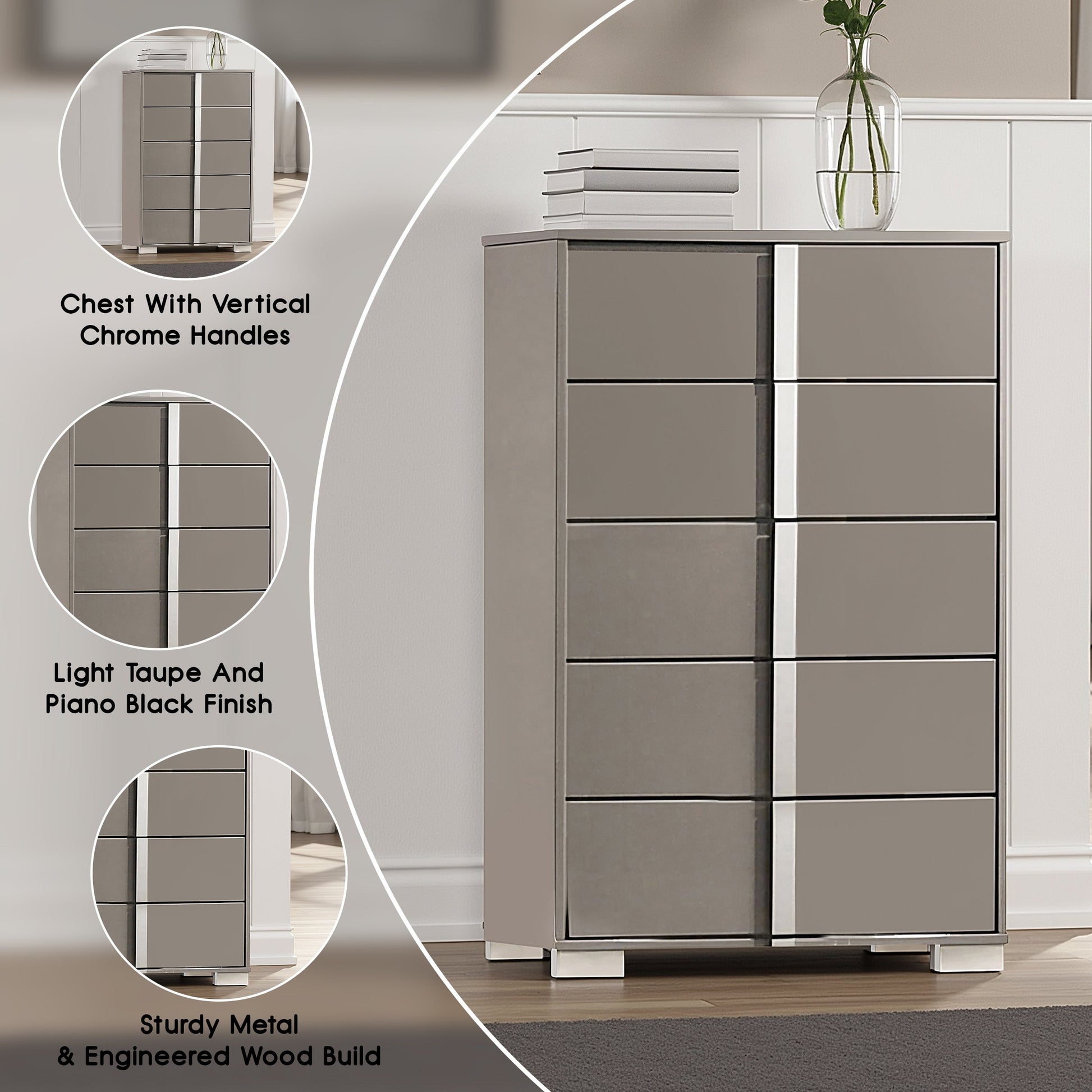 With a sleek silhouette and contemporary flair, this light taupe and piano black chest bring modern elegance to your bedroom. The chrome-finished vertical handles and matching legs add a bold metallic accent, while the UV finish enhances durability and surface gloss. Clean lines and muted tones ensure this piece fits seamlessly into any modern setting.