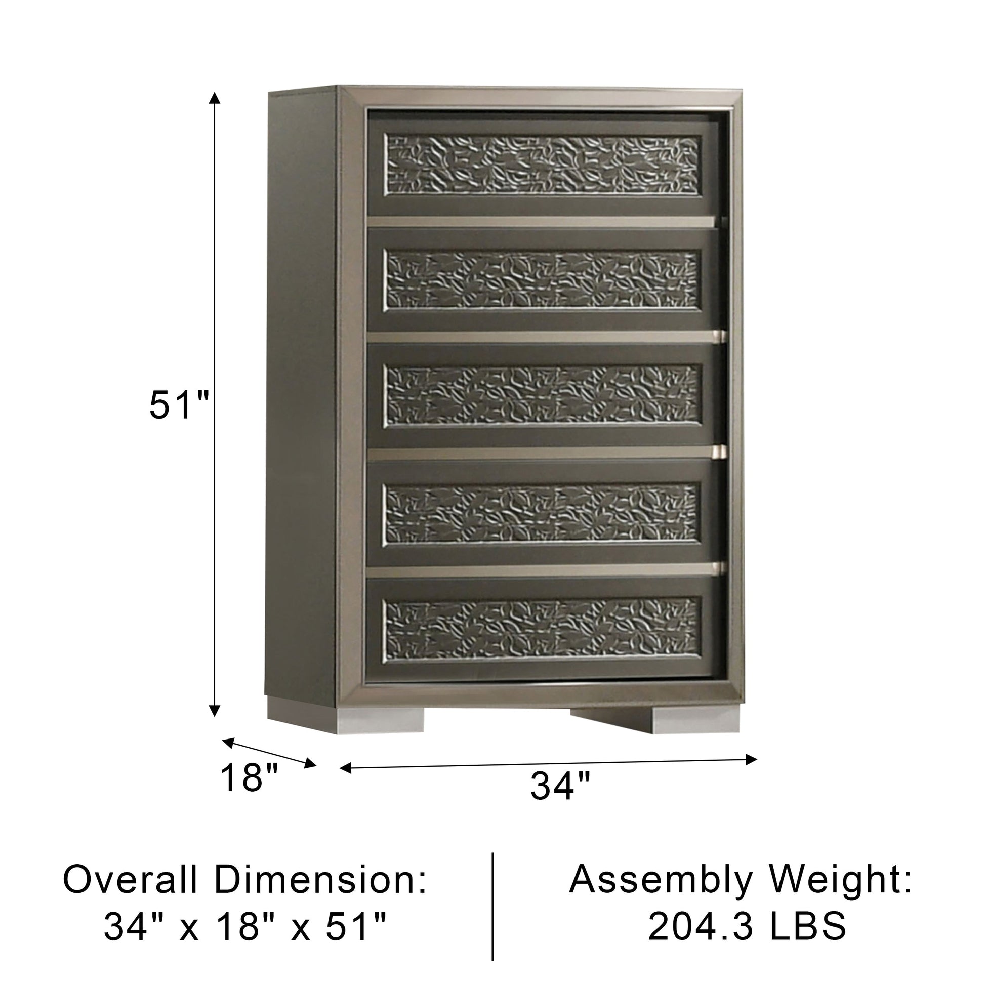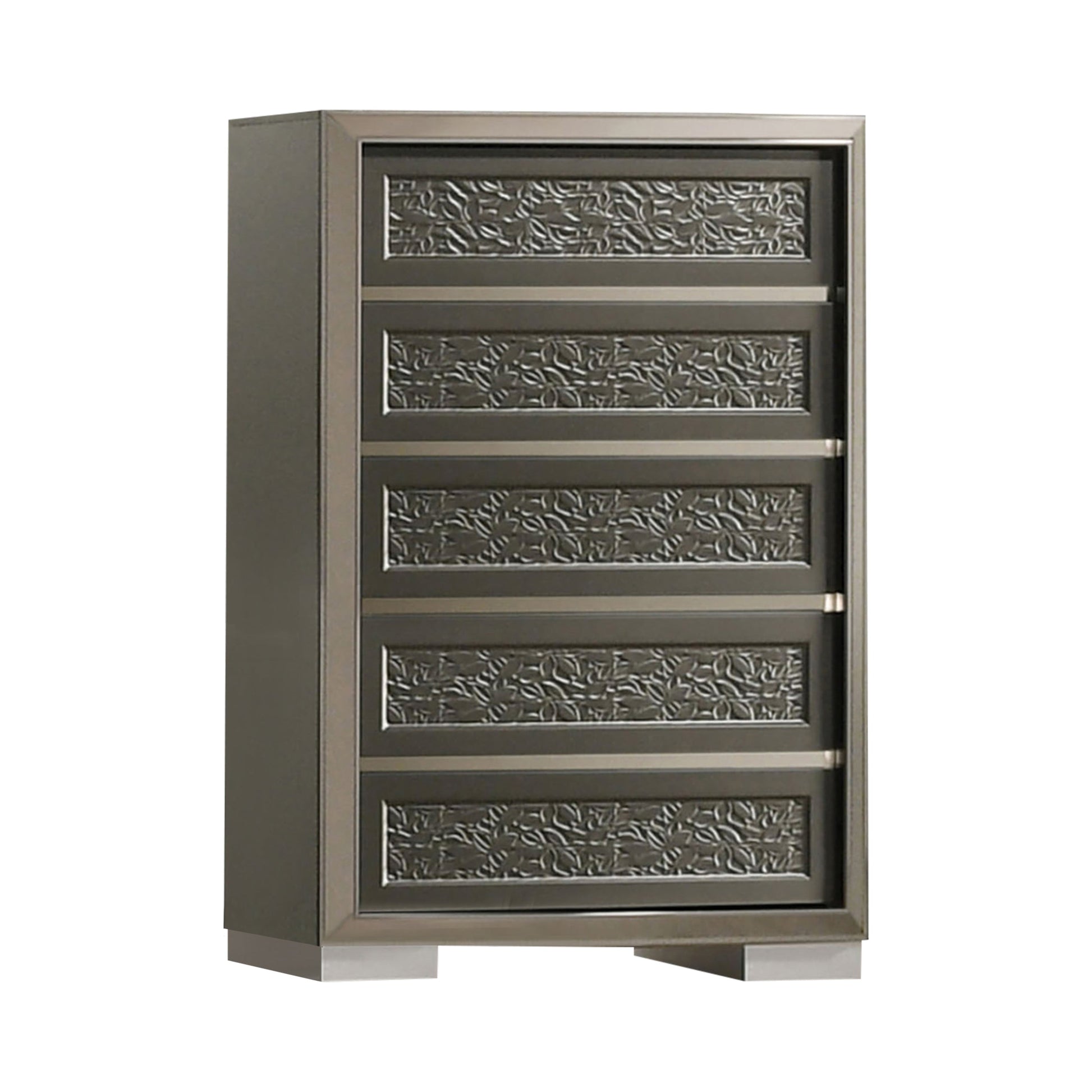 This contemporary chest blends refined design with practical storage solutions. Crafted from engineered wood, solid teak, and rubberwood, it features a rich dark gray finish for a sophisticated touch. Intricate leaf pattern moulding adds visual interest, while bracketed feet provide a stable and stylish base. The felt-lined top drawers keep delicate items safe, and smooth metal side glides ensure easy drawer access, making it as functional as it is elegant.