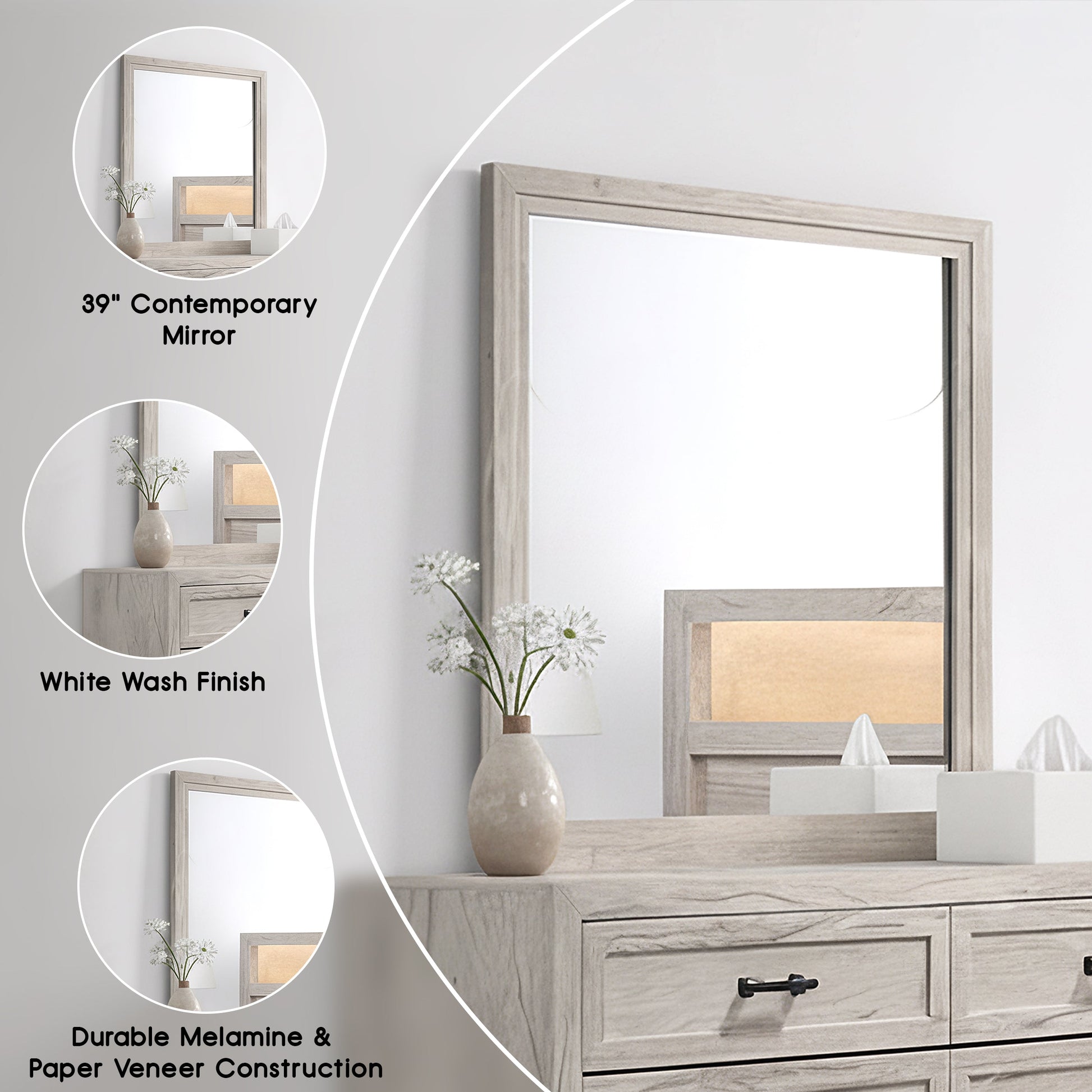This contemporary mirror is the perfect accent for a modern bedroom space. Finished in a crisp white wash, it brings brightness and simplicity to your decor. Designed to complement the rest of the collection, it pairs seamlessly with the matching dresser and features the same clean-lined look with coordinated black handles on accompanying case goods.