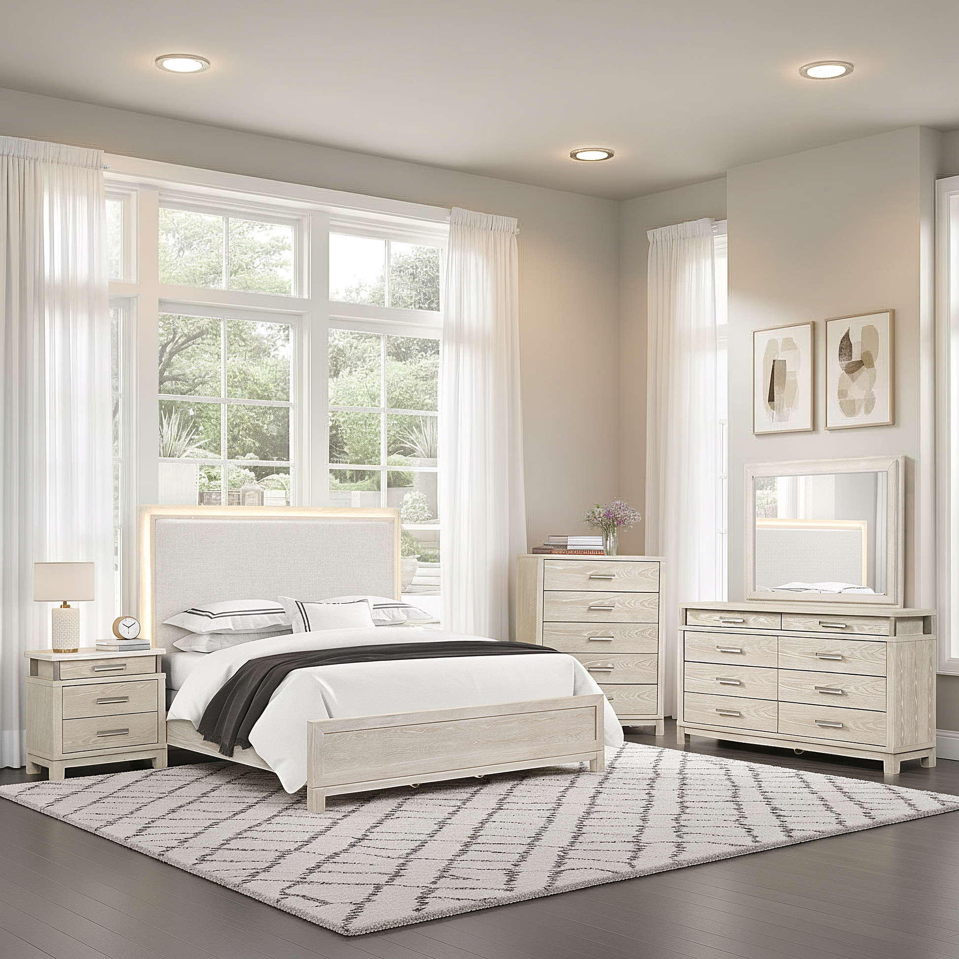 The Chavigny bedroom set blends transitional elegance with refined functionality, delivering a timeless yet modern look. Its weathered gray finish pairs beautifully with the soft upholstery and subtle metallic accents. From the LED-lit headboard to the marble-topped nightstand and linear hardware, every element is thoughtfully crafted. Storage pieces feature felt-lined drawers, ball-bearing glides, and dovetail construction for durability and luxury.